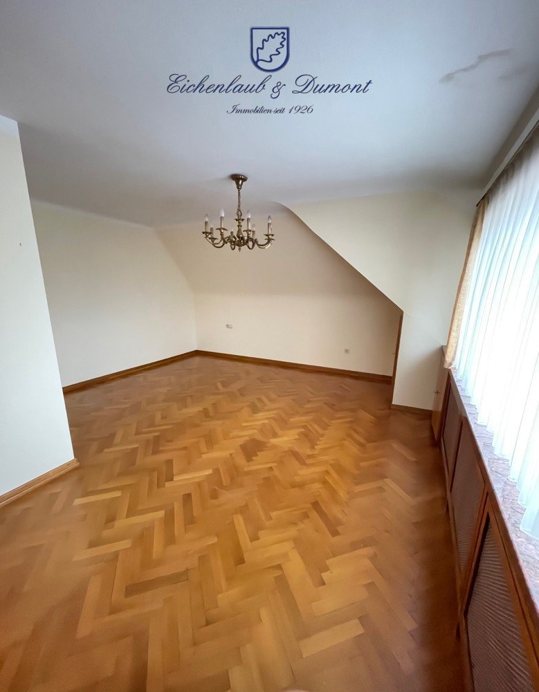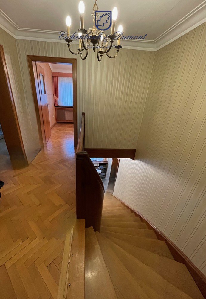 Im ersten Obergeschoss befinden sich vier Zimmer, eine Küche, ein Bad sowie ein Flur mit einer geschwungenen Holztreppe, die ins Dachgeschoss führt.