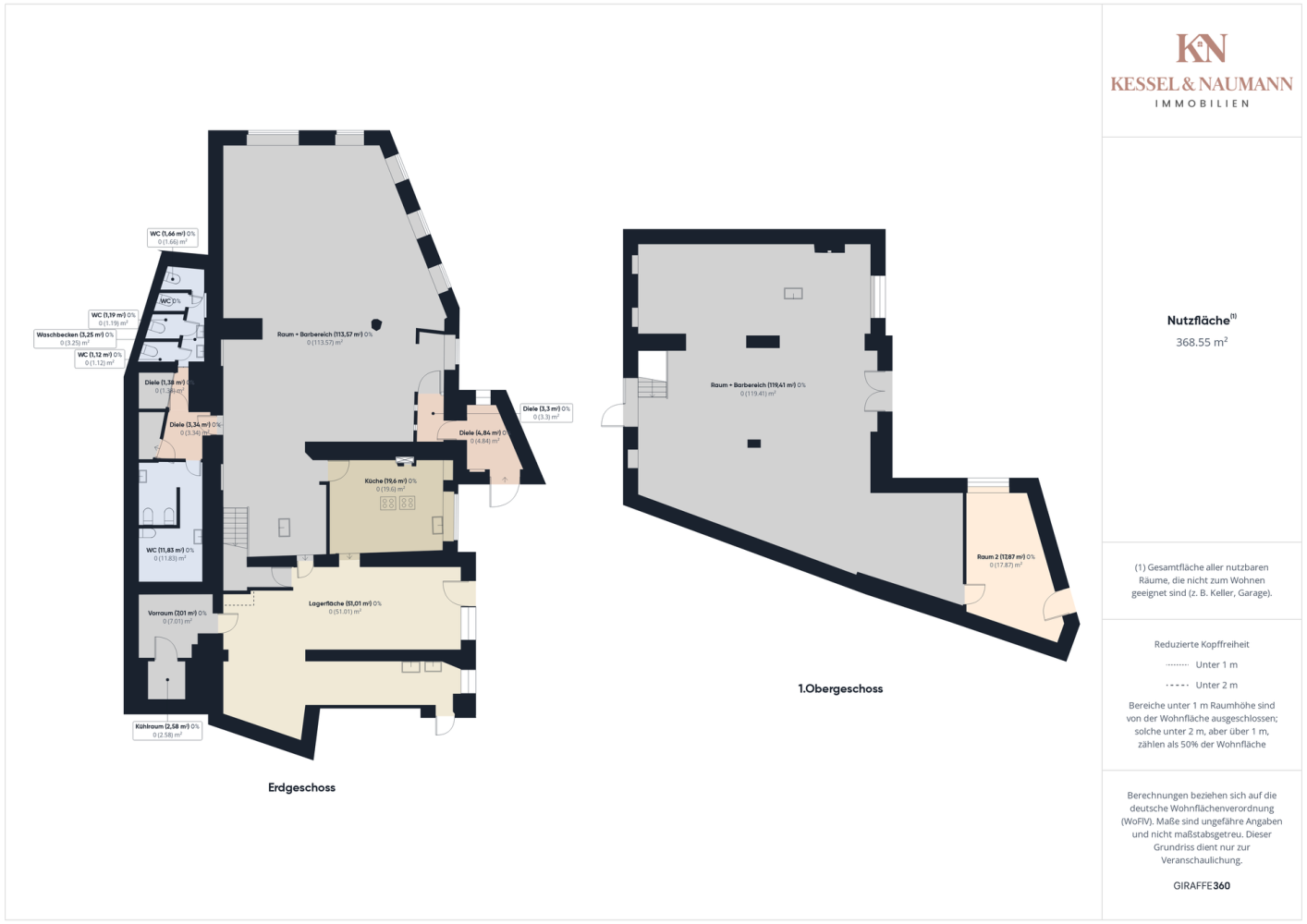 Etage (Obergeschoss): bis insgesamt ca. 368 m² (gesamt – beide Etagen) Die Etagen können separat genutzt werden oder als kombinierte Fläche über zwei Ebenen. Einzelraumaufteilungen nach Abstimmung möglich – z. B. Teilvermietung einer Etage und parallele Nutzung der anderen.