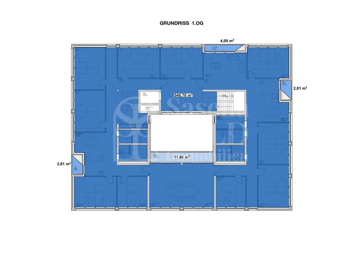 • 1. OG mit 10 Räumen, Besprechungsraum, Bad mit Dusche und WCs, Küche