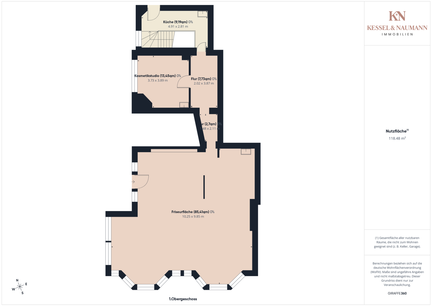 Der großzügige Friseurflächenbereich im Erdgeschoss bildet das Herzstück des Salons. Große Fensterflächen sorgen für eine helle, freundliche Umgebung und bieten optimale Bedingungen für den täglichen Kundenbetrieb. Ergänzt wird die Fläche durch ein separates Kosmetikstudio, das derzeit untervermietet ist und zusätzliche Einnahmen generiert.