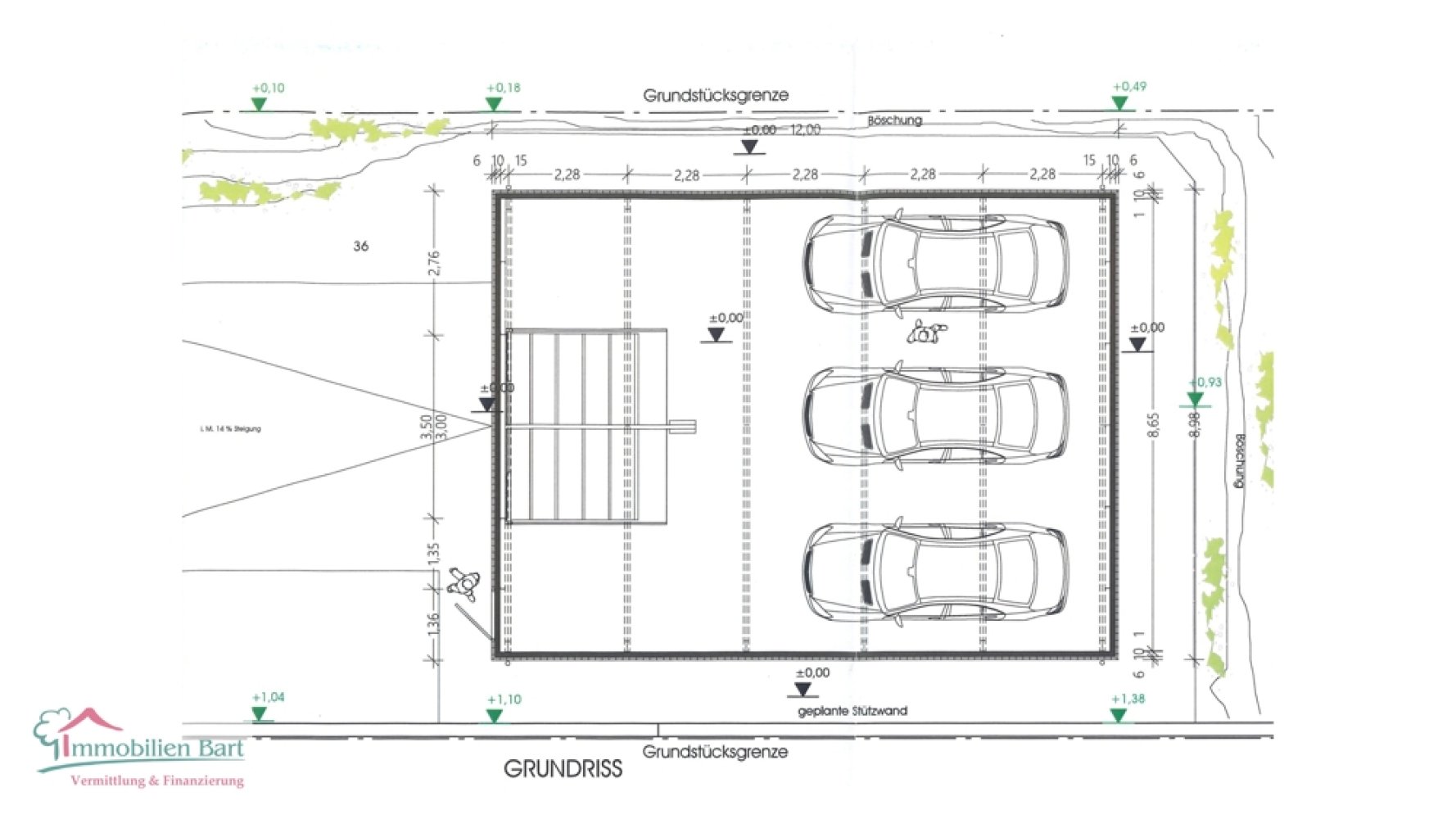 Die geplanten Garagen sind mit einer Grundfläche von 12 × 9 Metern vorgesehen und bieten ausreichend Platz für Fahrzeuge oder zusätzliche Lagerflächen. Das Grundstück selbst verfügt über eine Gesamtfläche von 782 m² und bietet damit gute Nutzungsmöglichkeiten sowie eine übersichtliche Bebauung.