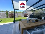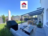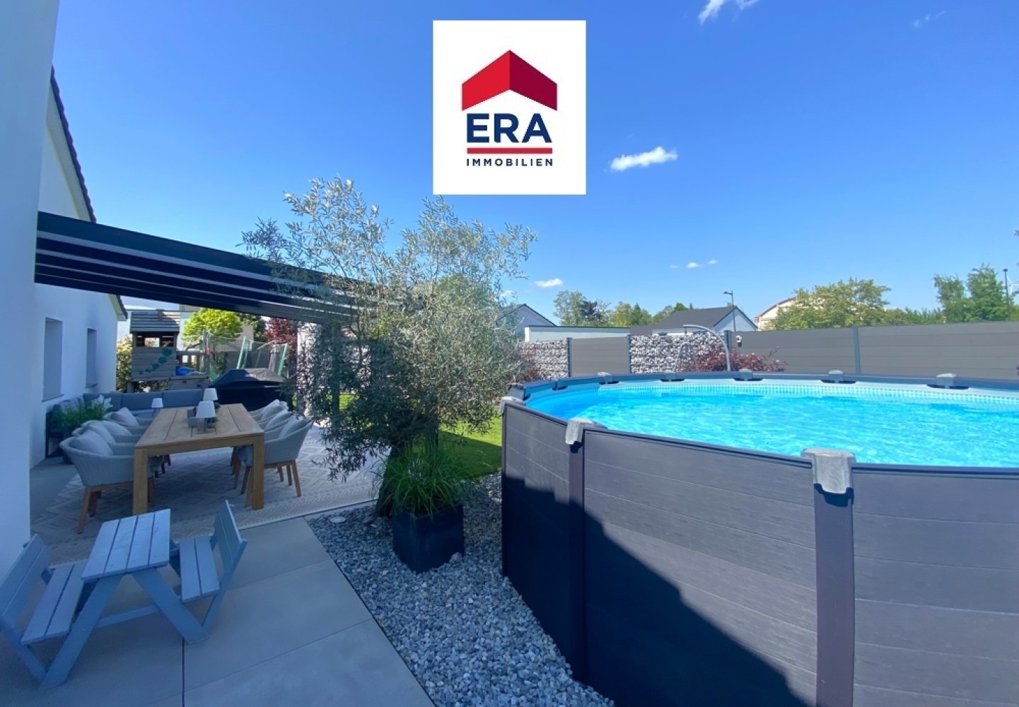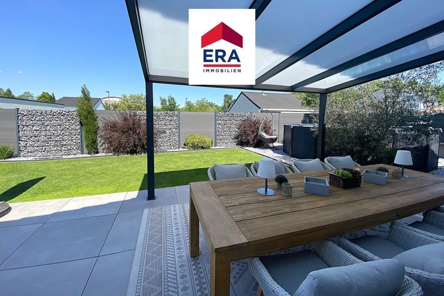Die überdachte Terrasse mit gemütlichem Sitzbereich ermöglicht auch bei Regen, entspannte Stunden im Freien. Der modern angelegte Pool sowie der wundervoll gestaltete Garten bieten genügend Platz für Freizeitmöglichkeiten mit der gesamten Familie. Der Garten ist ebenfalls über ein seitliches Tor neben dem Haus erreichbar, ein Garten-Gerätehaus und eine elegant angelegte Grillstelle runden dieses Angebot ab.