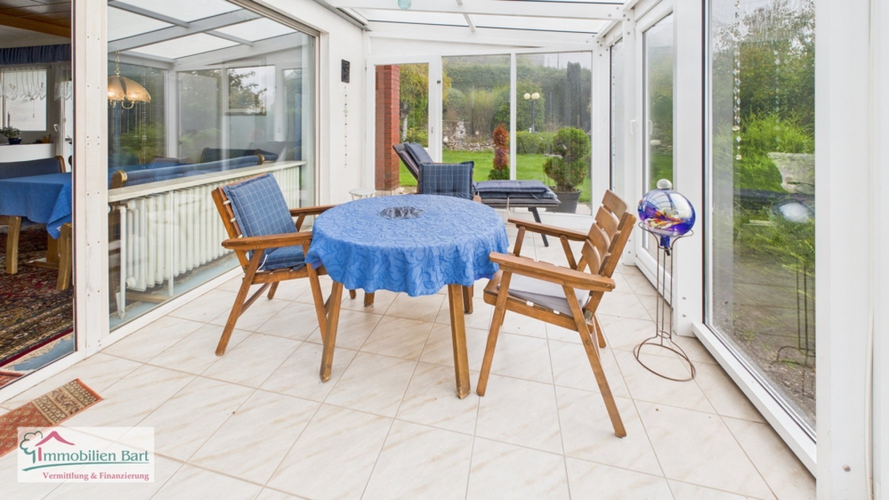 Diele, Abstellraum, Küche mit Ausgang auf die Terrasse und Garten, Wohn-Essbereich mit Ausgang zum Wintergarten sowie zum Balkon, Flur, 2 Schlafzimmer, Badezimmer, Hauswirtschaftsraum