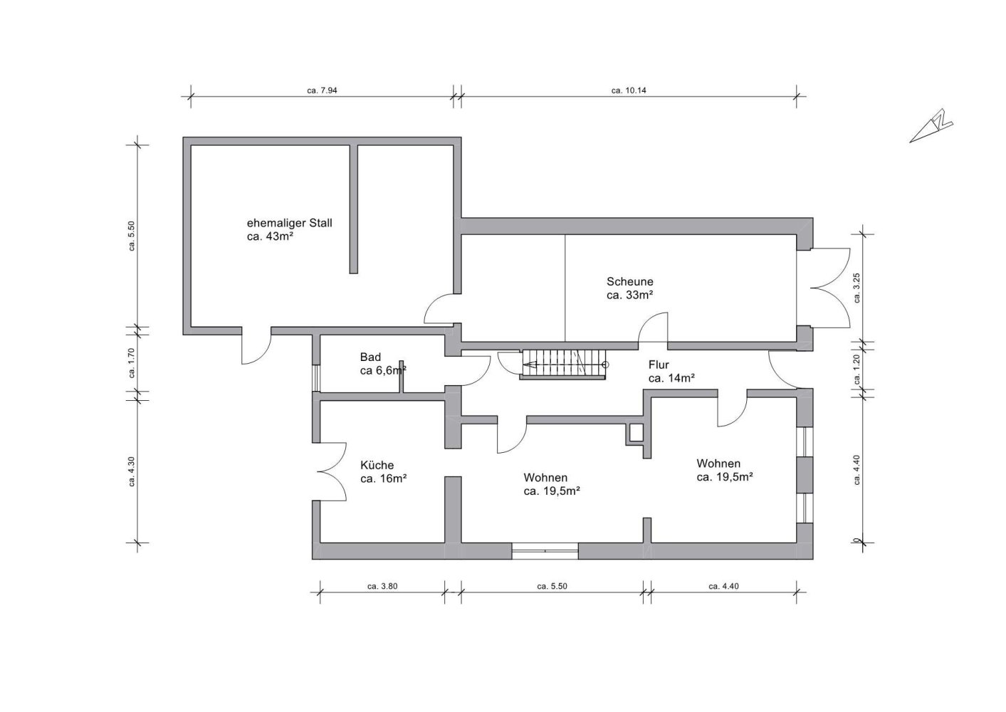 Zudem befinden sich im Erdgeschoss das Badezimmer, der Zugang zum Keller und die Verbindung zur ehemaligen Scheune.