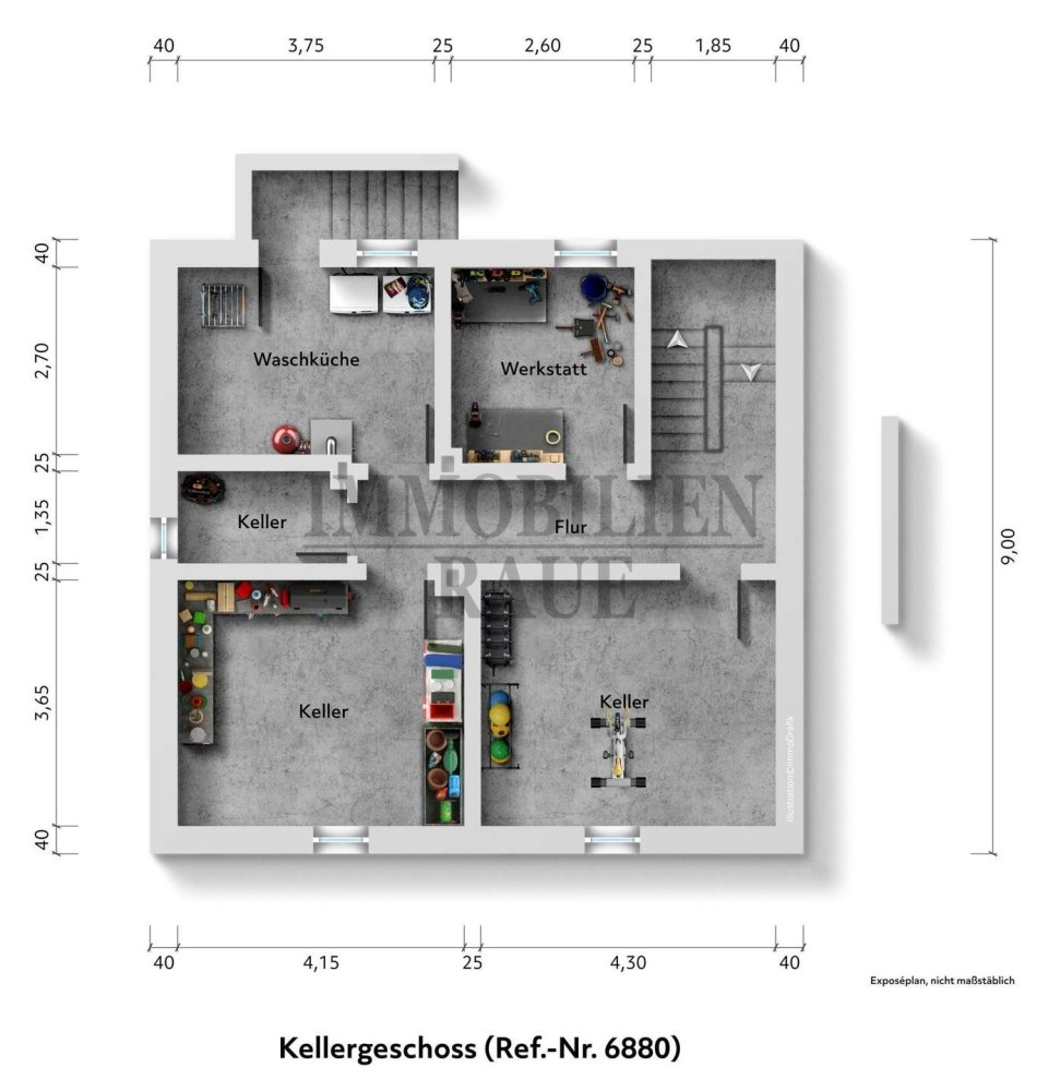 Im Kellergeschoss befinden sich drei Kellerräume sowie eine Waschküche mit Heizungsbereich, von der aus man direkt in den Garten gelangt.