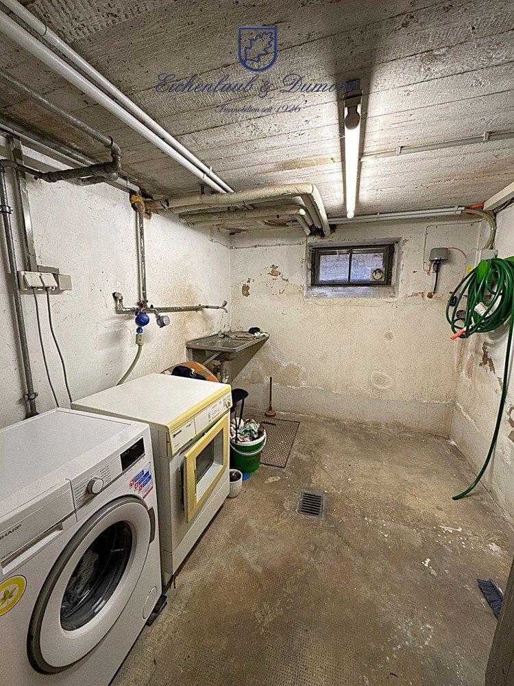 Im Kellergeschoss steht die gleiche Fläche zur Verfügung, dort befinden sich der Heizungsraum, der Raum für die Waschmaschinen, ein Trockenraum und zwei weitere Kellerräume.