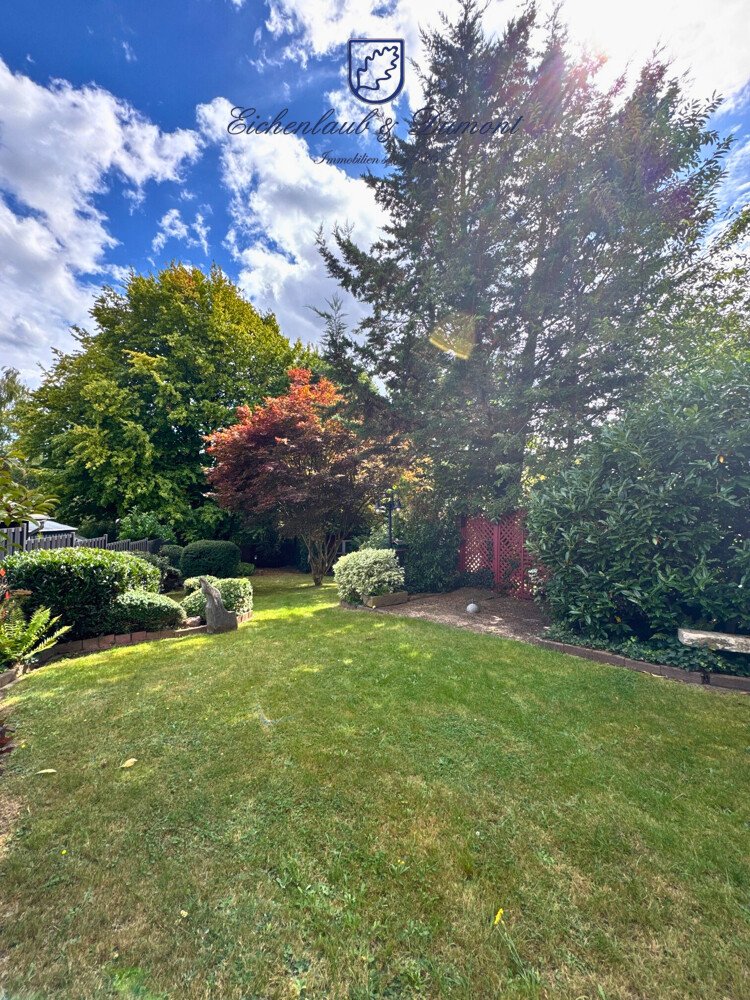 Über die überdachte Terrasse gelangt mit in den wunderbaren, parkähnlich angelegten Garten mit einem überdachten Freisitz. Dorthin gelangt man übrigens auch durch die Garage, die über eine Treppe mit dem Garten verbunden ist, und auch unterkellert.