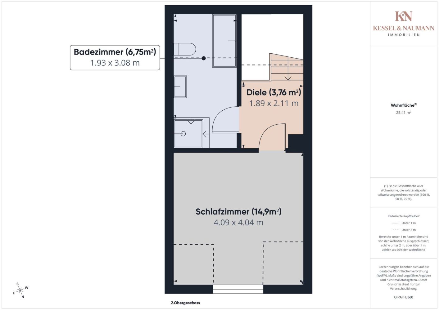 Im Dachgeschoss befindet sich das Badezimmer mit Dusche, Wanne, WC, Waschbecken und Fenster, sowie das Schlafzimmer, das durch seine Lage im obersten Geschoss besonders ruhig wirkt.