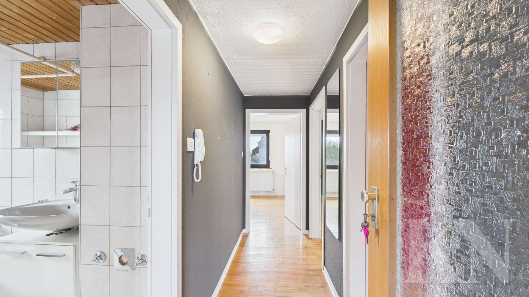 Das Haus befindet sich in einer ruhigen Sackgasse – ein Wohnumfeld, das Ruhe, Privatsphäre und Sicherheit vereint. Die beiden Hauptwohneinheiten im Erdgeschoss und Obergeschoss sind klar strukturiert und eignen sich hervorragend zur Aufteilung in getrennte Wohnbereiche – ideal für Familien, aber auch für Kapitalanleger, die über eine Teil- oder Vollvermietung nachdenken. Der schöne Dielenboden, der mit etwas Aufarbeitung wieder seinen ursprünglichen Charme entfaltet, verleiht beiden Wohneinheiten einen warmen Charakter. Balkone und Loggia erweitern die Wohnflächen ins Freie und bieten je nach Tageszeit gemütliche Außenbereiche.