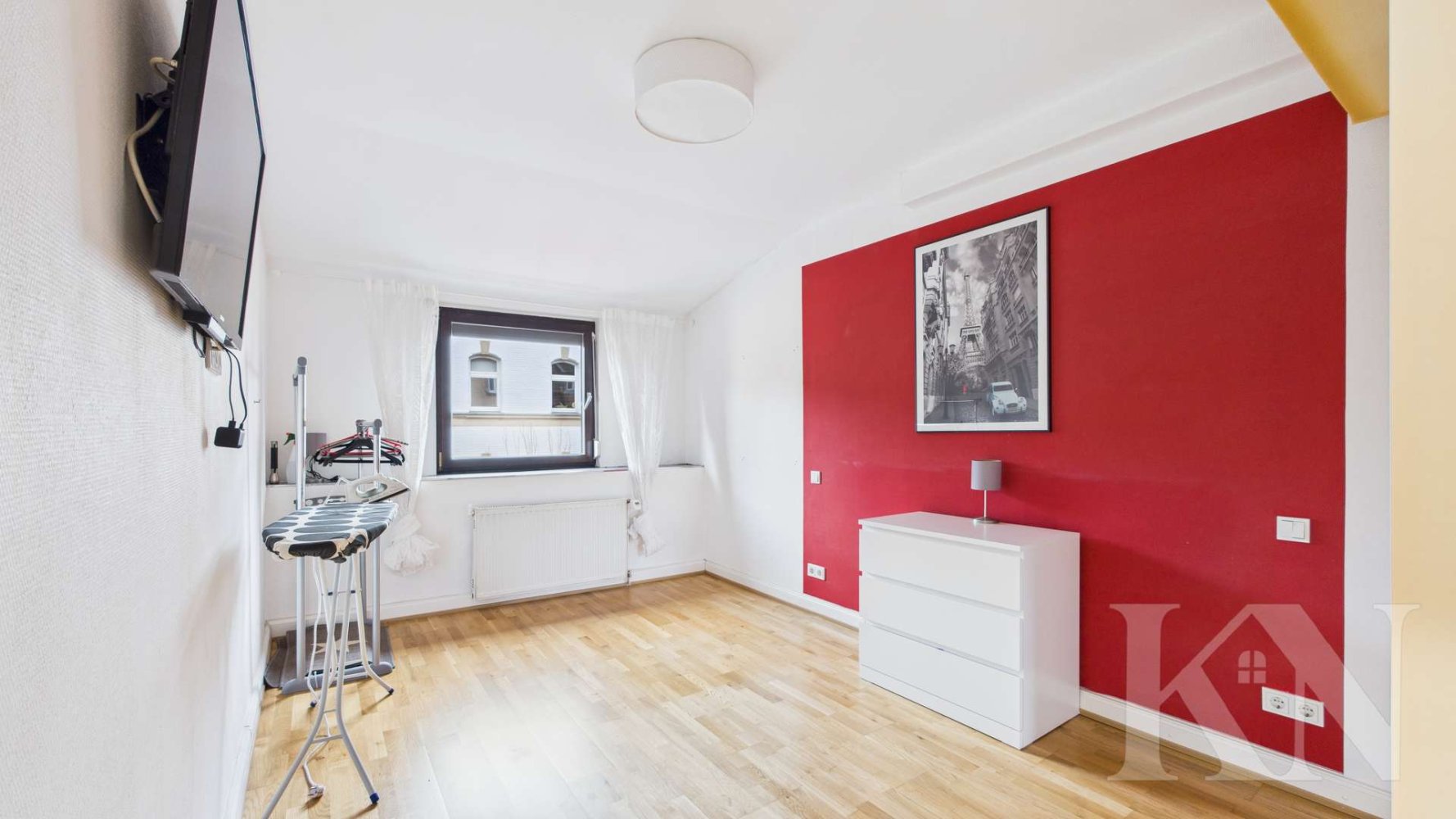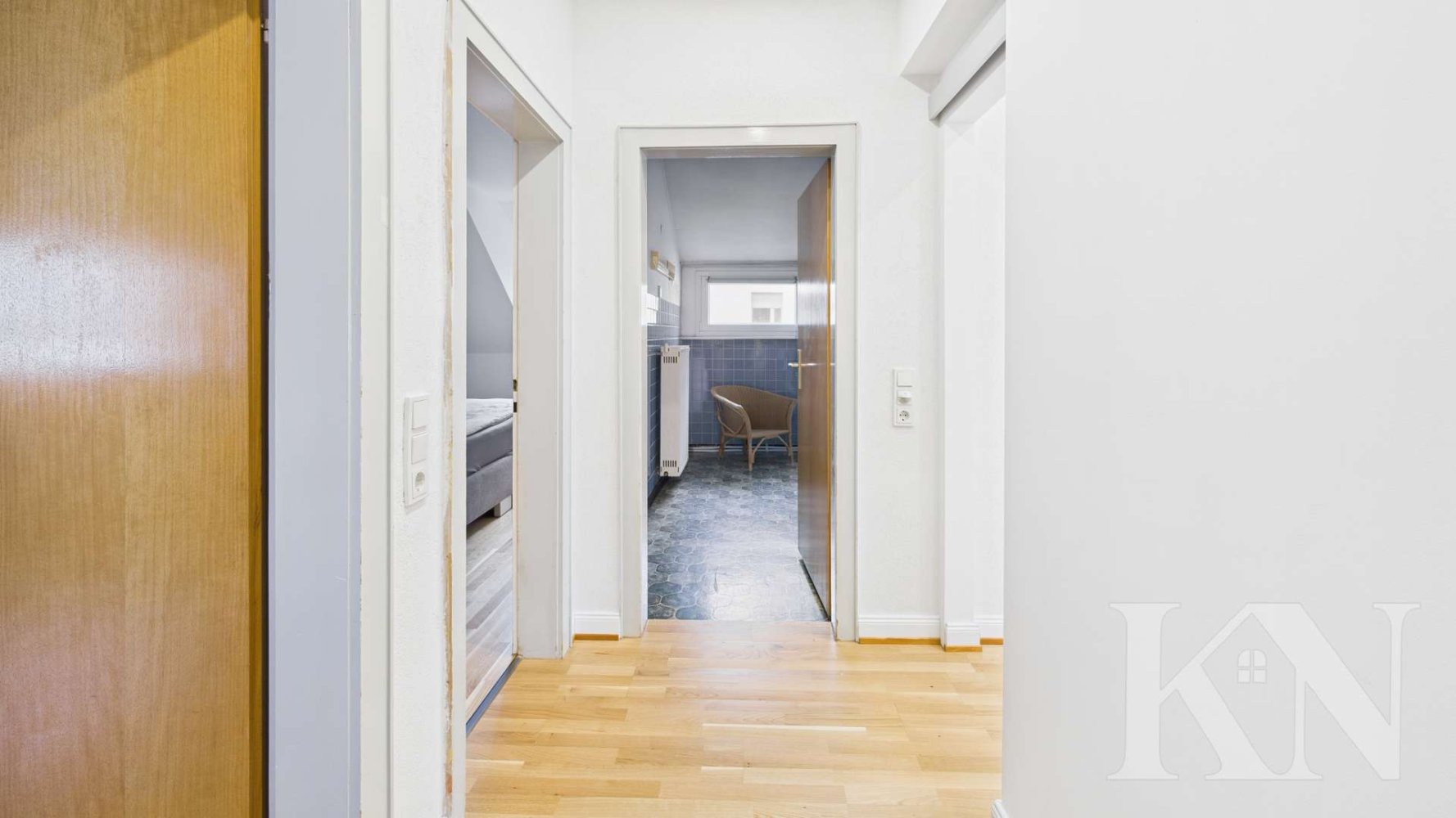 Im Obergeschoss stehen ein großes Schlafzimmer, ein Kinderzimmer sowie ein Ankleidezimmer zur Verfügung. Ein Badezimmer befindet sich ebenfalls auf dieser Ebene, das zudem die Möglichkeit bietet, es vollständig nach eigenen Vorstellungen neu zu gestalten und modern anzupassen. Der Grundriss eignet sich optimal für Familien oder Paare mit Platzbedarf.