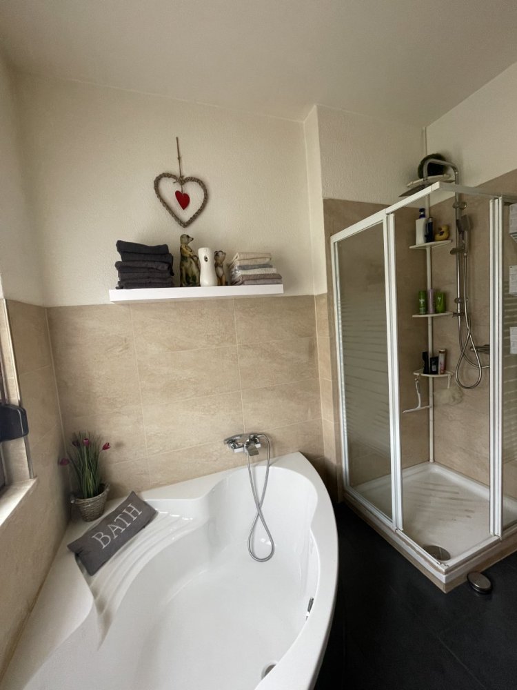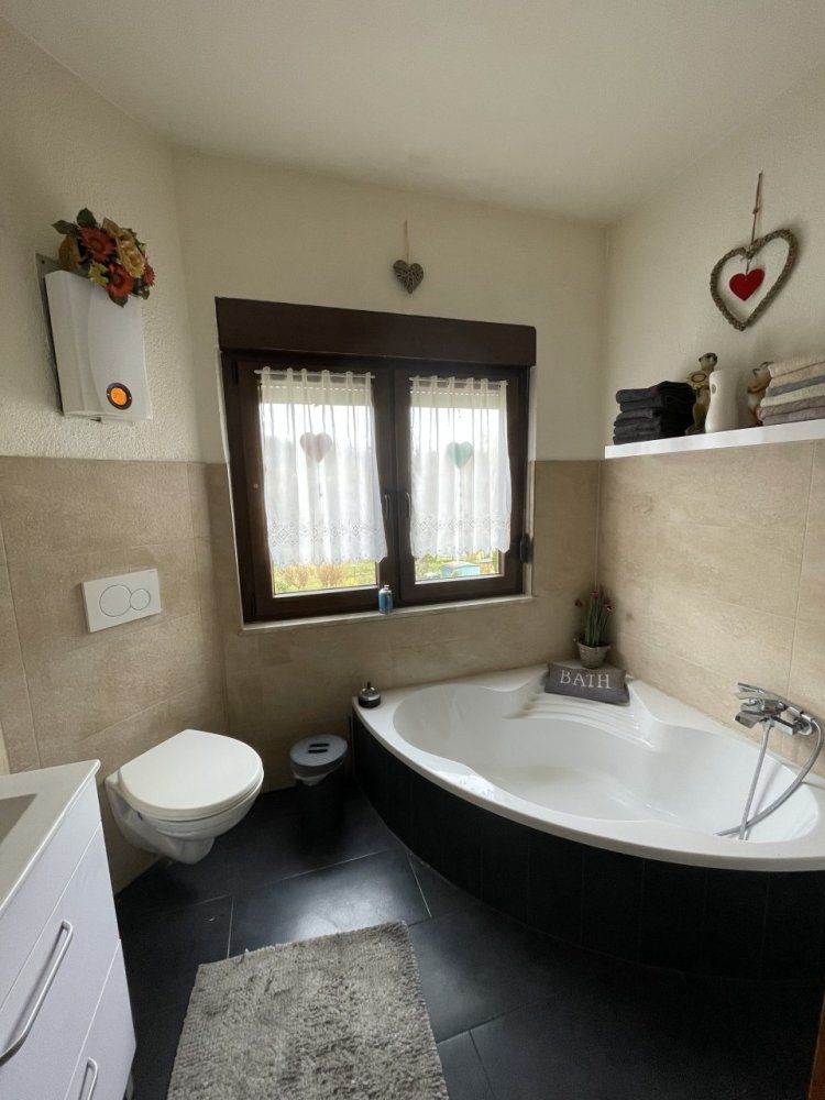 Erdgeschoss: Flur, 2 Schlafzimmer, offene Küche-/Essbereich mit Zugang zur Terrasse, Wohnzimmer, Badezimmer mit Badewanne und Dusche (Tageslicht) (wird vom Verkäufer selbst bewohnt)
