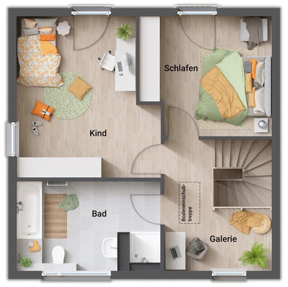 Im Obergeschoss bietet das Kinderzimmer viel Raum zur Entfaltung. Schlaf- und Badezimmer laden zum Abschalten und Entspannen ein. Besonderes Highlight – die lichtdurchflutete Galerie.