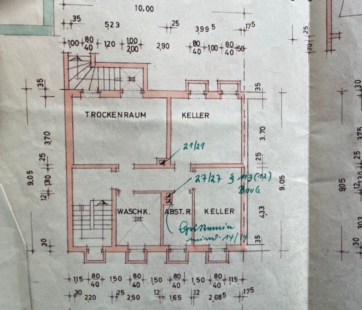 Im Kellergeschoss steht die gleiche Fläche zur Verfügung, dort befinden sich der Heizungsraum, der Raum für die Waschmaschinen, ein Trockenraum und zwei weitere Kellerräume.