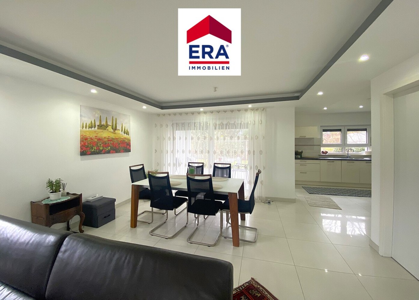 Über den Eingangsbereich mit großem Schiebetüren-Spiegelschrank und Gäste WC mit Waschbecken, erreichen Sie den lichtdurchfluteten Wohn-, Essbereich mit moderner Küche und Zugang zur Terrasse mit Garten.