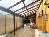 Das separate Gebäude nebenan beinhaltet eine Doppelgarage, eine große Werkstatt und einen Abstellraum, die weitere überdachte Terrasse davor kann zur gemütlichen Sitzecke umgestaltet werden.