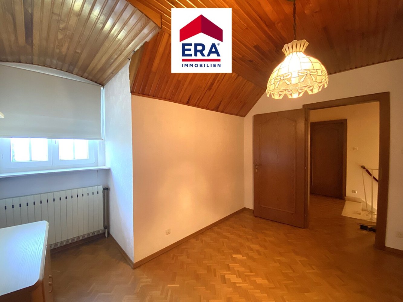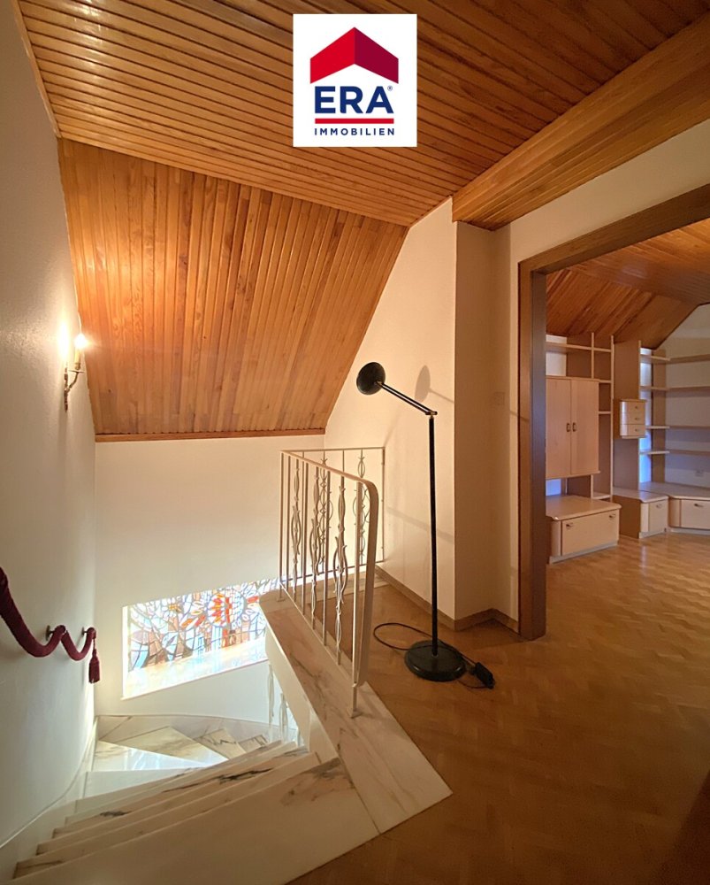 Der Aufgang vom Wohnbereich zum OG ist ein wahrer Eyecatcher, über die ansehnlichen Marmortreppen mit imposantem Gusseisengeländer und buntem Bleiglasfenster erreichen Sie 2 weitere Schlafzimmer, sowie ein Badezimmer mit Dusche, Waschbecken und WC.
