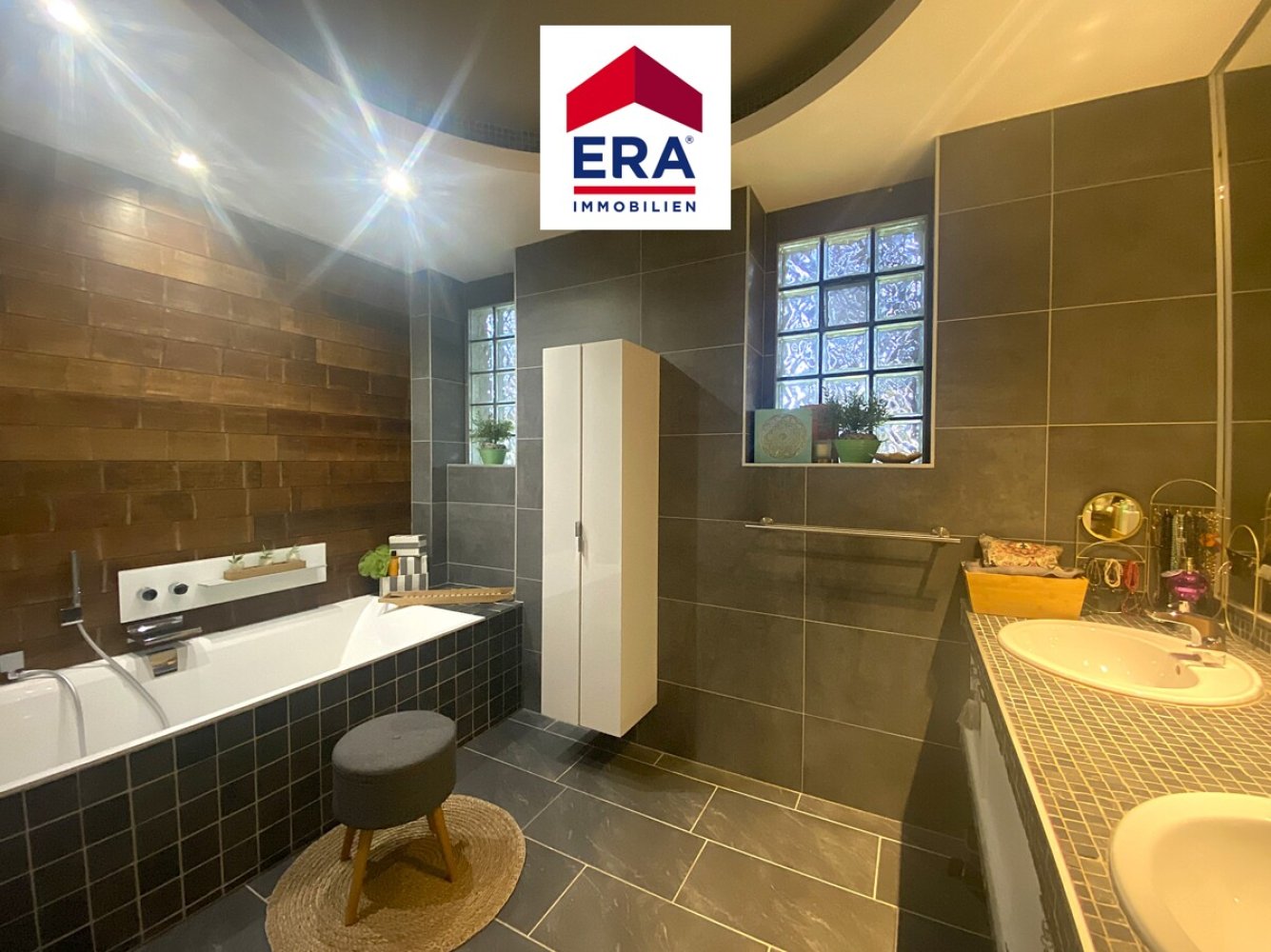 Über ein paar Außenstufen gelangen Sie zur Diele im EG mit Einbauschränken, hier befinden sich über 2 Ebenen, der helle Wohnbereich mit Kamin und der Zugang zum idyllischen Wintergarten mit Balkon und Markise. Des Weiteren finden Sie hier die Küche mit Sitztheke und Vorratskammer sowie das ansehnliche Esszimmer, ein exotisches Badezimmer mit Doppelwaschbecken und Wanne, ein separates WC mit Waschbecken, sowie 2 Schlafzimmer, eines davon mit Einbauschrank und eines mit Zugang zum Balkon mit Blick ins Grüne.