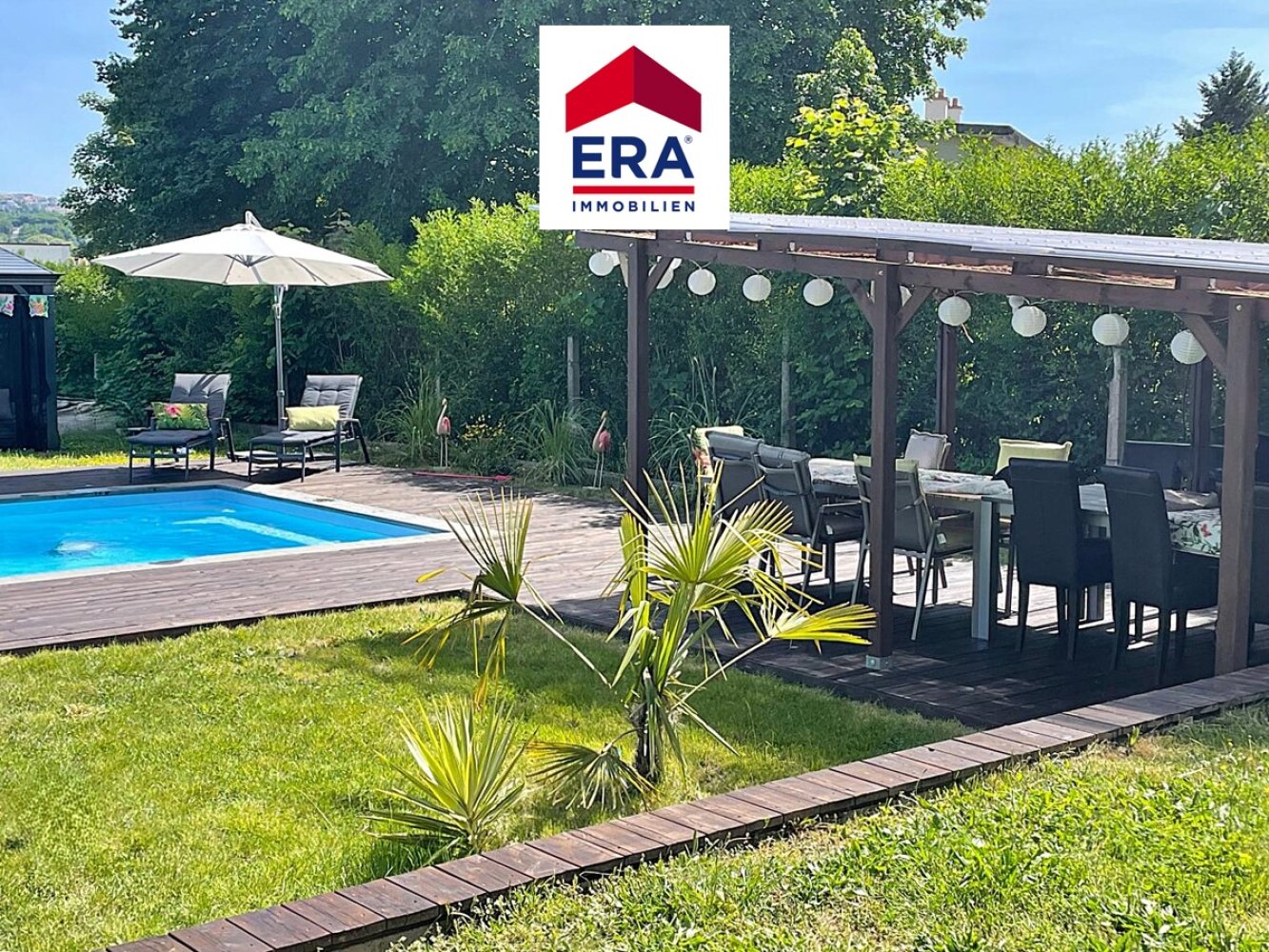 Der großzügige Garten mit Südausrichtung und eingelassenem Pool, lässt keine Wünsche offen. Hier ist bei außergewöhnlichem Weitblick, Entspannung garantiert, unter dem überdachten Terrassenbereich oder der gemütlichen Pergola, ist immer ein schattiges Plätzchen zu finden.