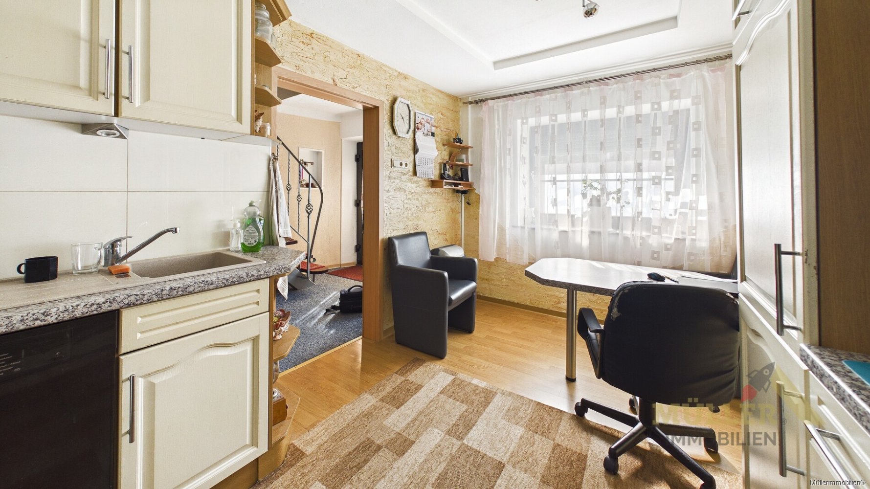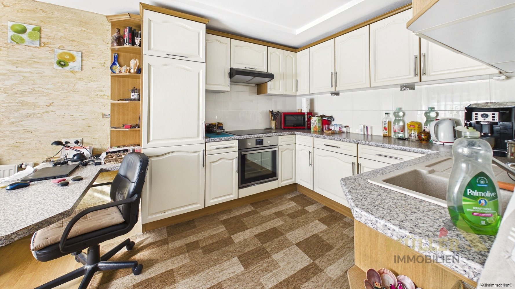 Die Böden sind überwiegend mit Laminat und Fliesen ausgestattet und unterstreichen den gepflegten Gesamteindruck. Eine vorhandene Einbauküche ist bereits integriert und bietet eine praktische Grundlage für den sofortigen Start im neuen Zuhause.
