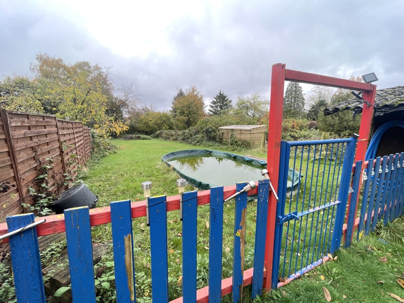 Das weitläufige Grundstück überzeugt mit einem liebevoll angelegten Garten, einem Gartenhaus und einem Pool , ideal zum Entspannen und für Freizeitaktivitäten im Freien.