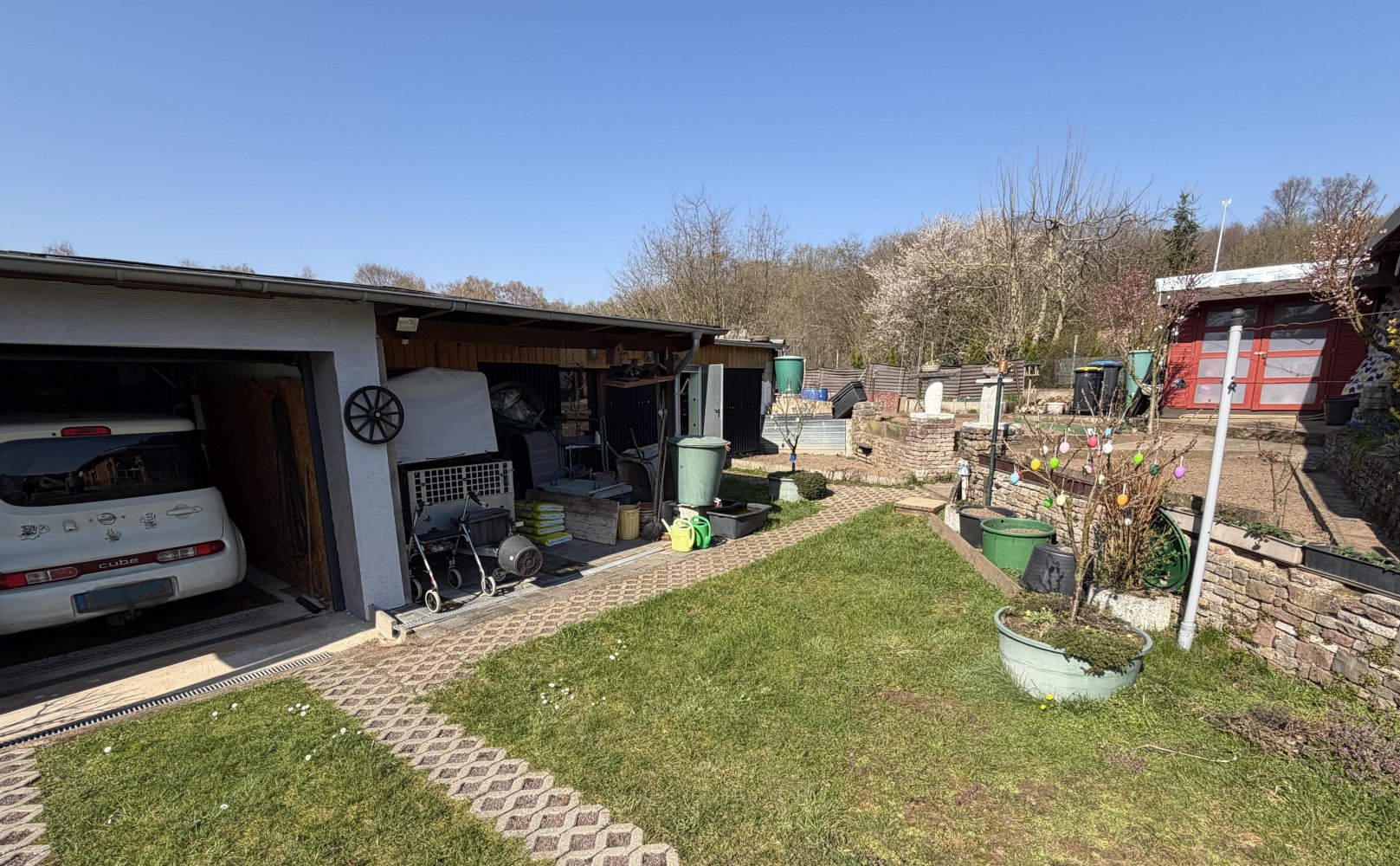 Eine freistehende Garage mit Strom- und Wasseranschluss, ein überdachter Stellplatz, eine Werkstatt und ein Geräteraum bieten Raum für Hobbys, Projekte oder zusätzlichen Stauraum.