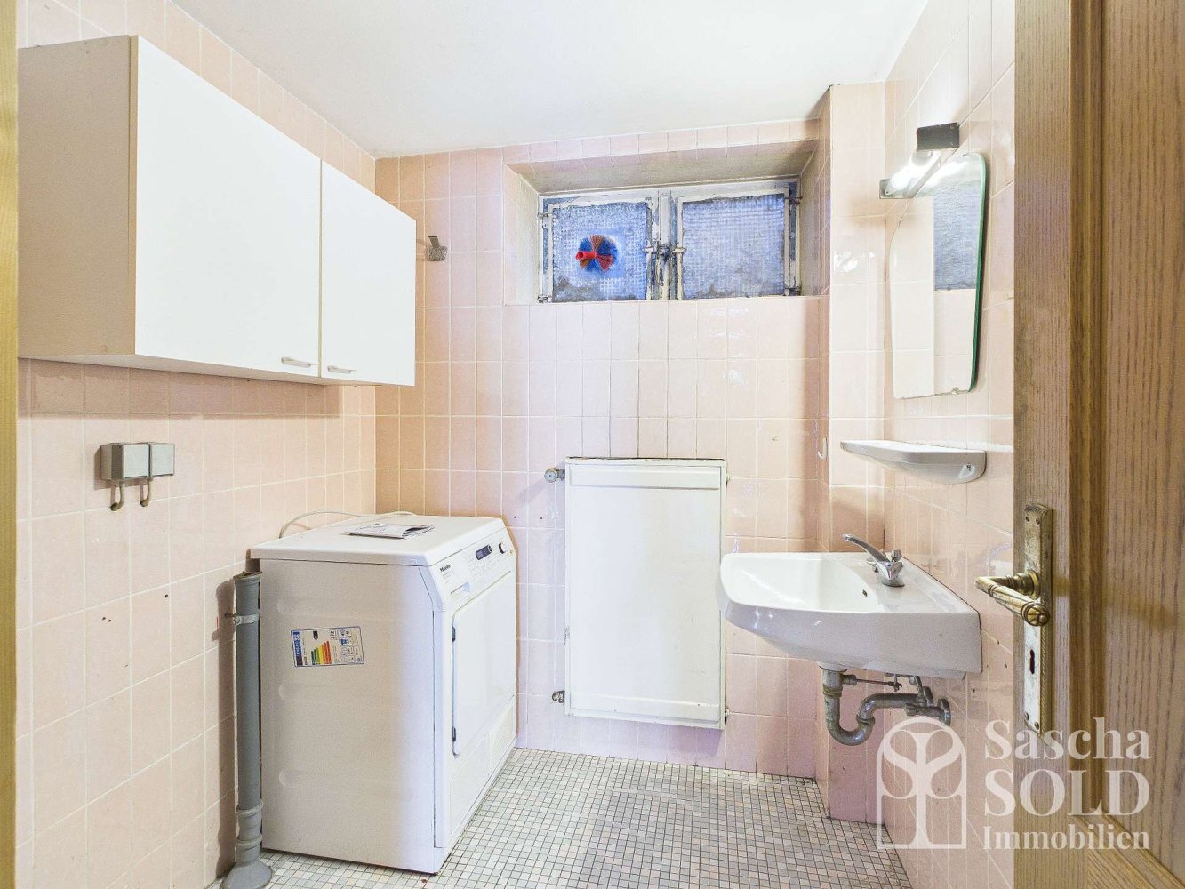 Über die Diele im Eingangsbereich führt eine Treppe in das Untergeschoss, welches weitere Wohn- und Nutzflächen bietet. Hier stehen insgesamt drei Schlafzimmer zur Verfügung, eines davon mit einer Terrassentür und direktem Zugang zu einer überdachten Terrasse sowie in den Garten. Das Badezimmer ist ausgestattet mit Eckbadewanne, Dusche und Sauna und bietet damit einen komfortablen Wellnessbereich im eigenen Haus. Ergänzt wird diese Ebene durch drei Kellerräume sowie zwei massiv errichtete Nebenräume, die sich flexibel als Ausbaureserve oder als Lagerfläche für Gartengeräte und -mobiliar nutzen lassen.