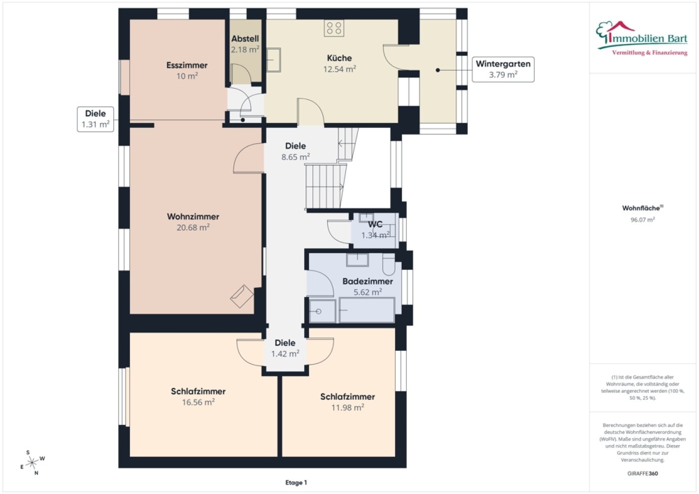 Küche mit Zugang zum Wintergarten, Abstellkammer, Esszimmer, Wohnzimmer, Diele, Gäste-WC, Tageslichtbad mit Wanne und Dusche, 2 Schlafzimmer