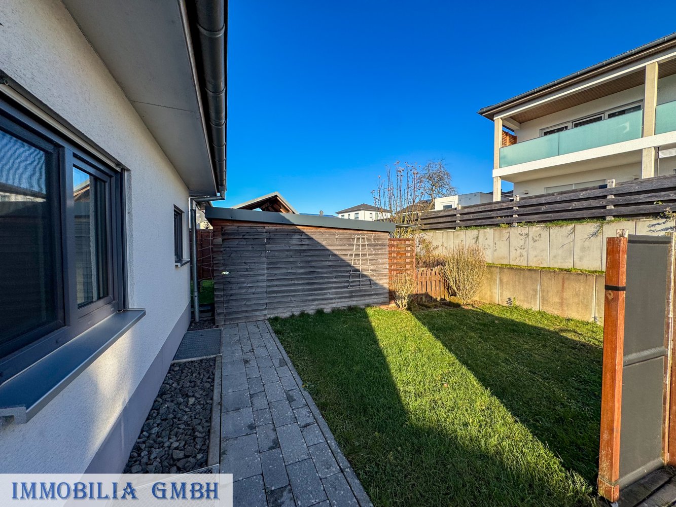 Das Grundstück umfasst insgesamt 521 m² und bietet hinter dem Haus einen gepflegten Garten mit Terrasse sowie ein praktisches Gartenhaus. Der Garten ist in östlicher Richtung ausgerichtet und lädt besonders in den Morgen- und Vormittagsstunden zum Entspannen im Freien ein. Für ausreichend Parkmöglichkeiten ist ebenfalls gesorgt: Links neben dem Haus befinden sich zwei Garagen mit elektrischen Toren, während vor dem Gebäude drei weitere Außenstellplätze für PKW zur Verfügung stehen.