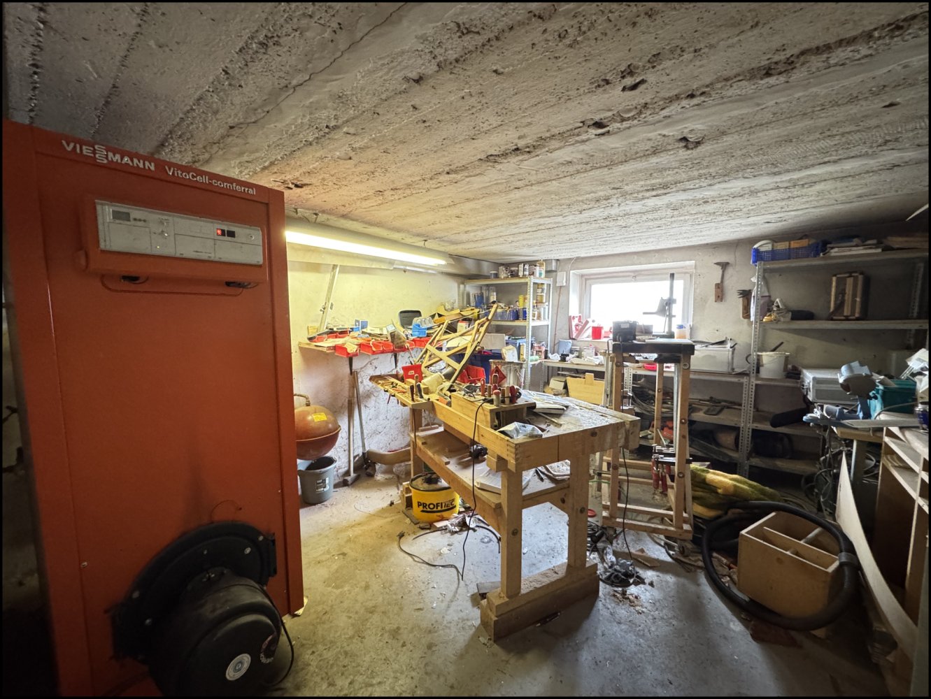 Ein Kamin sorgt für eine angenehme Atmosphäre. Zusätzliche Nutz- und Abstellflächen bietet der Keller.