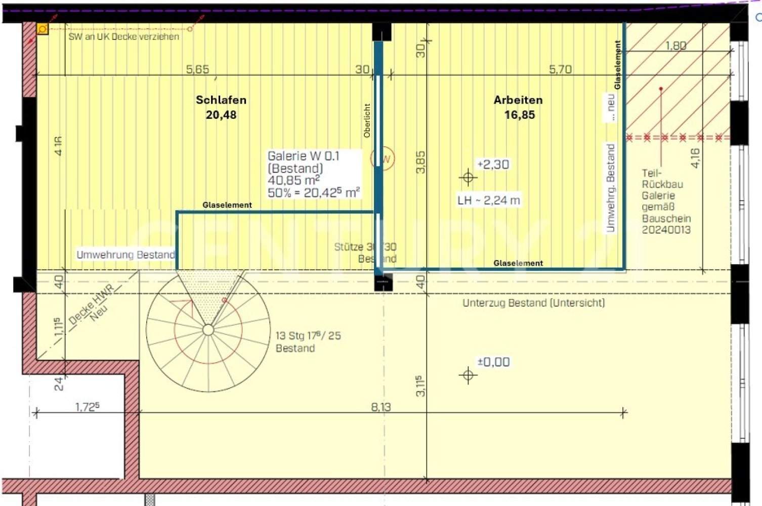 Eine gut 40m² große, offene Galerie bietet massenhaft zustätzliche Fläche und auf Wunsch können wir Ihnen die gesamte Galerie oder einen Teil davon noch als einen oder mehere Räume abteilen. Die Raumhöhe entspricht natürlich nicht genau der üblichen Wohnraumhöhe, weshalb wir diese Fläche nur hälftig in die Wohnfläche eingerechnet haben. Zu der angegebenen Wohnfläche von 110m² (inkl. hälftiger Galerie) kann man also ca. 20m² nutzbare Fläche auf der Galerie kostenlos dazu nutzen.