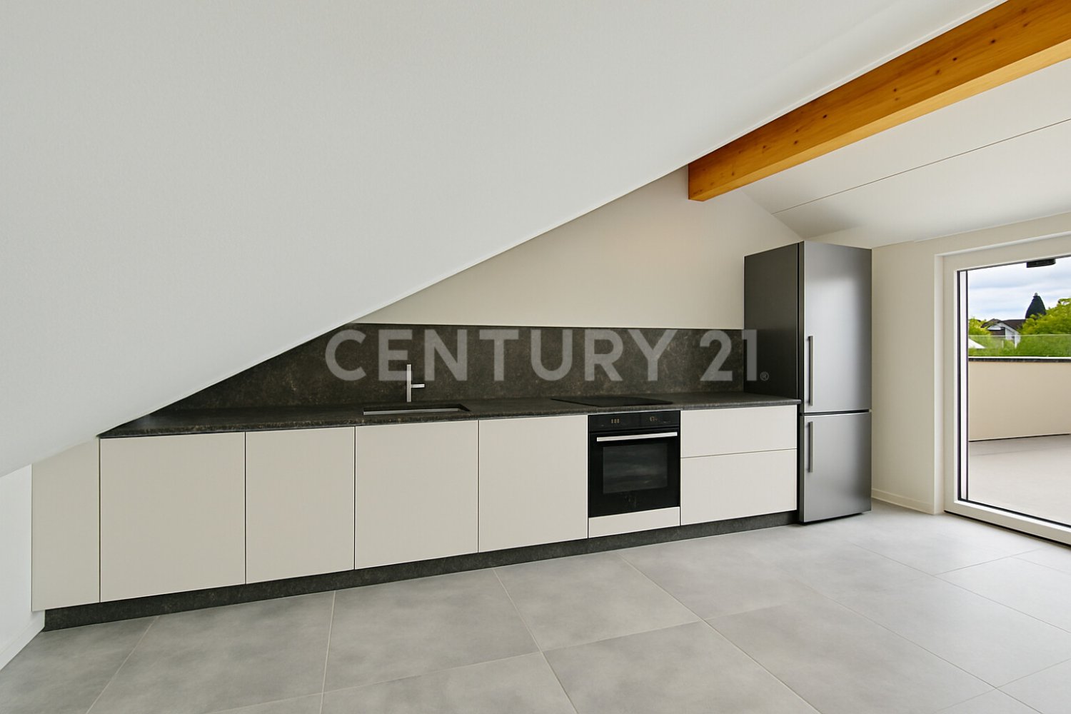 Das Herzstück der Wohnung ist der großzügige Wohn- und Essbereich mit integrierter Küche, der durch seine offene Gestaltung ein besonders einladendes Ambiente schafft. Große Fensterfronten fluten den Raum mit Licht und führen direkt hinaus auf den herrlichen Balkon, der zum Entspannen im Freien einlädt. Ein charmantes Balkenelement verleiht dem Wohnbereich zusätzlich eine warme und unverwechselbare Note und verbindet modernen Neubaukomfort mit gemütlicher Wohnatmosphäre.