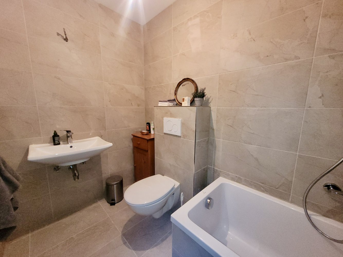 Die Wohnung verfügt über Parkett- und Fliesenböden, der aktuell vorhandene Teppichboden wird vor dem Verkauf entfernt.