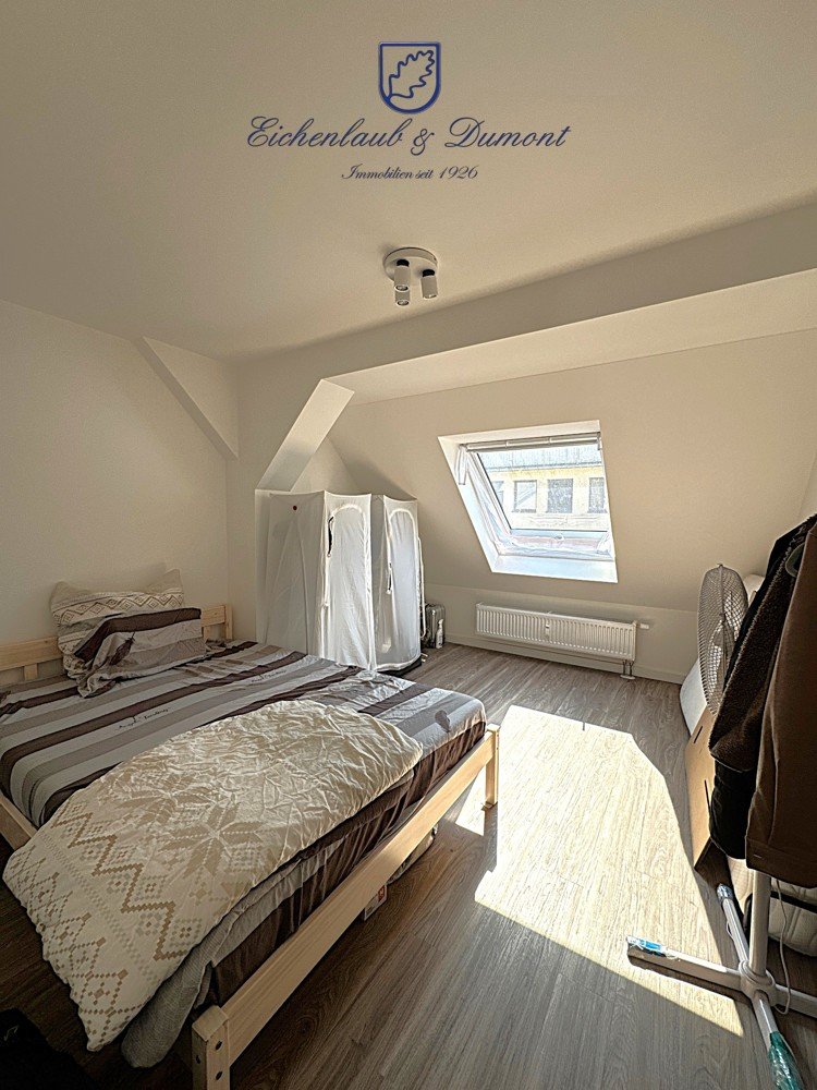 Über einen offenen Durchgang in der Diele gelangt man in das Schlafzimmer, an das ein Badezimmer angrenzt.