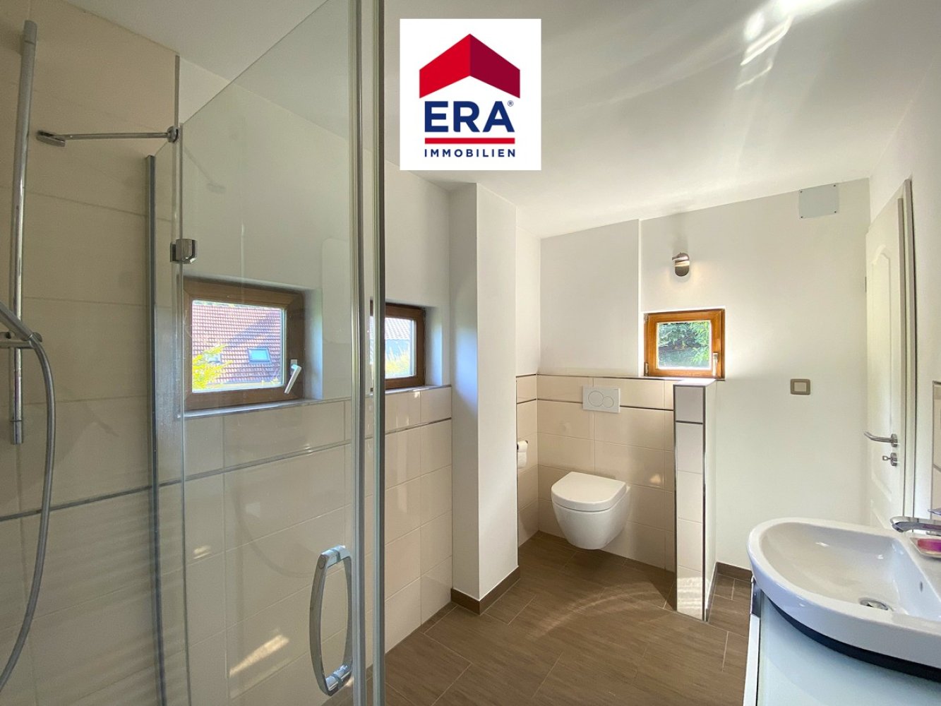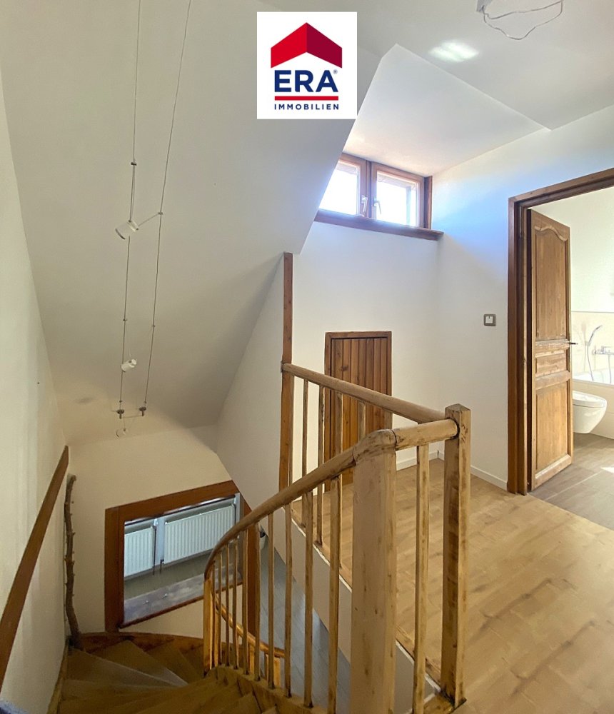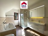Im OG erreichen Sie 2 Schlafzimmer, eines davon mit französischem Balkon und ein Badezimmer mit Doppelwaschbecken, Dusche, Wanne und WC.