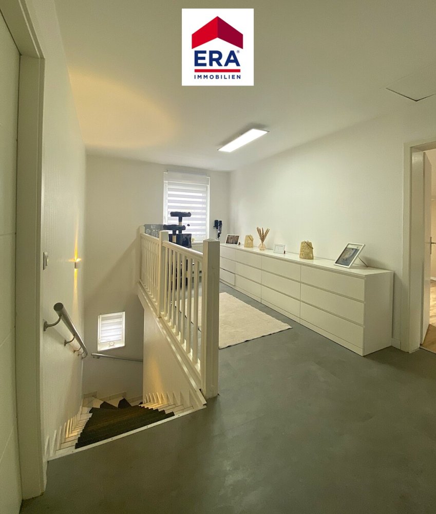Im OG finden Sie ein großes, lichtdurchflutetes Schlafzimmer mit beidseitigen Dachschrägen, ein Badezimmer mit Dusch-Wanne, Doppelwaschbecken und WC sowie 2 weitere Schlafzimmer.