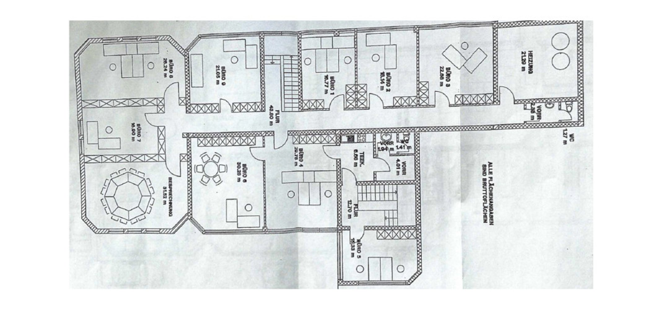 Die Bürofläche selbst ist aktuell aufgeteilt in 8 Büroräume, den Heizungsraum und die getrennten WC-Anlagen.