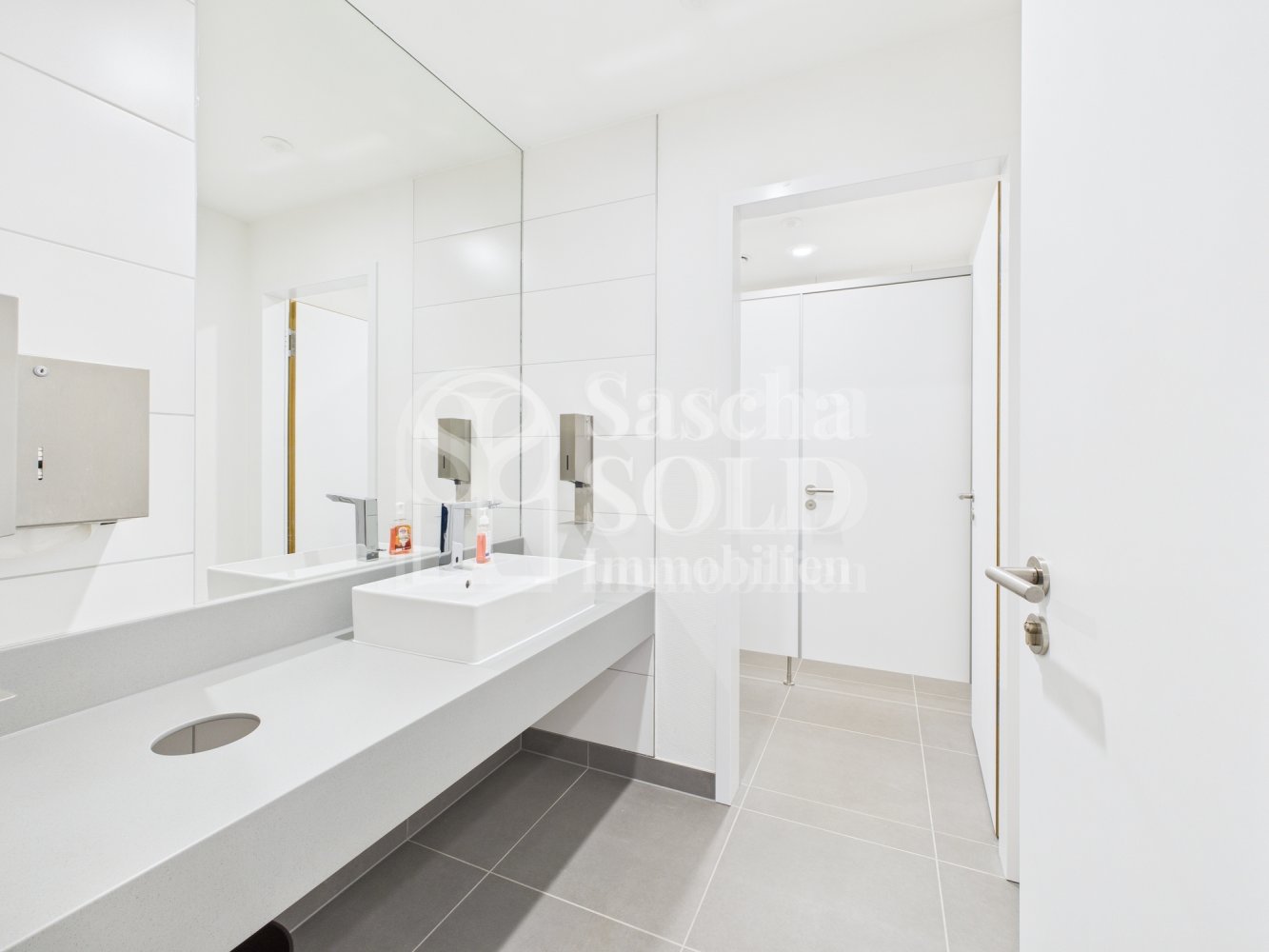 Das erste Obergeschoss mit ca. 562 m² bietet weitere Büroräume, kleinere Meetingzonen mit Küche sowie einen großen Besprechungsraum. Getrennte WC-Anlagen für Damen und Herren, teilweise mit Duschen, runden das Raumangebot ab.