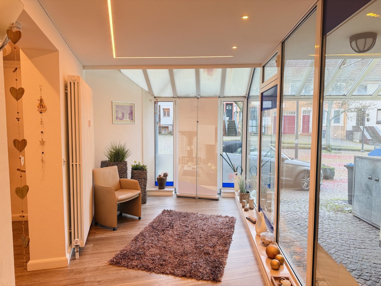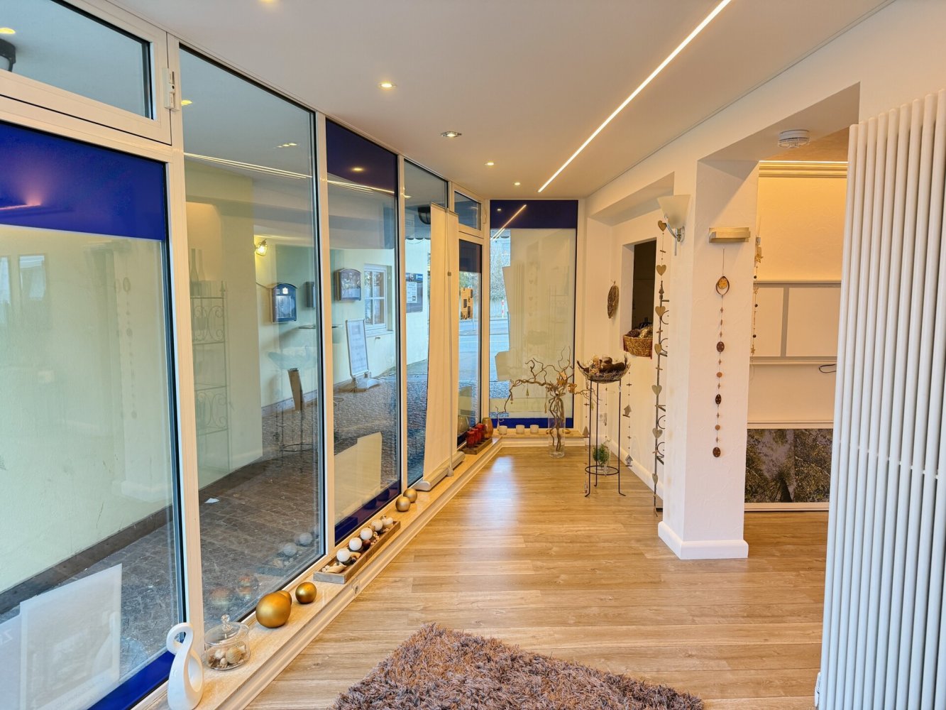 Im Erdgeschoss empfängt ein großzügiger, offener Verkaufs- bzw. Geschäftsraum, der durch große Fensterflächen hervorragend belichtet wird und eine optimale Präsentation ermöglicht. Der Raum geht fließend in einen lichtdurchfluteten Wintergarten im rückwärtigen Bereich über, wodurch eine angenehme Atmosphäre mit zusätzlicher Nutzfläche entsteht.