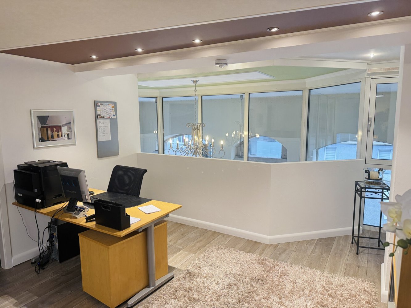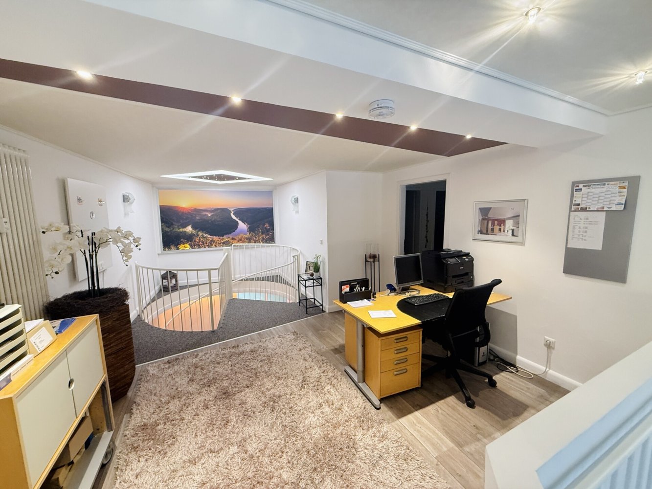 Das Obergeschoss ist über eine stilvolle Wendeltreppe erreichbar und besticht durch eine offene Galerie, die einen attraktiven Blick in den unteren Eingangsbereich ermöglicht. Auf dieser Ebene befinden sich ein separates Büro, ein Besprechungsraum, ein Badezimmer sowie zwei getrennte WC's - ideale Voraussetzungen für eine klare Trennung von Kunden- und Arbeitsbereichen.