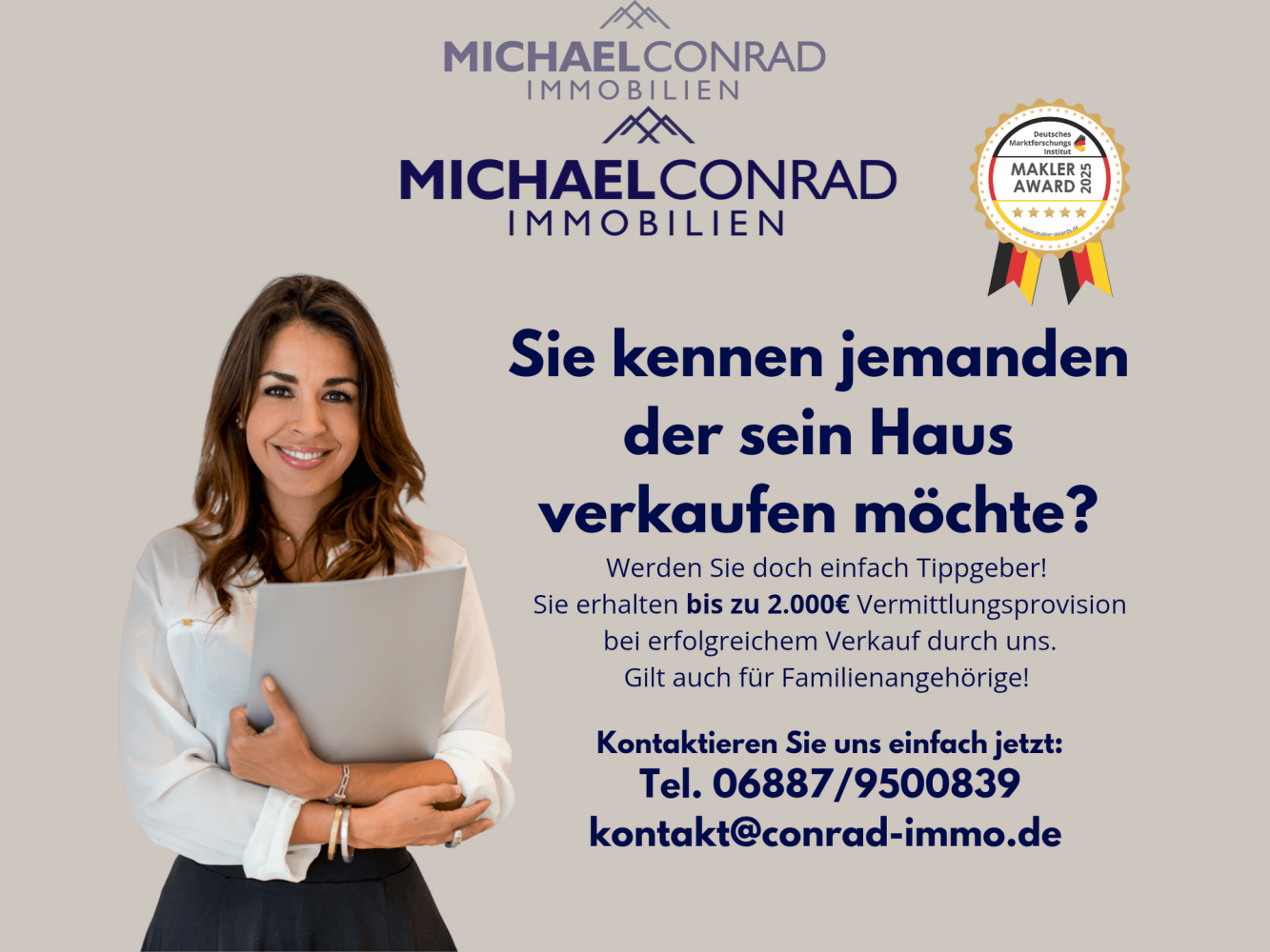 Sie möchten Ihre Immobilie verkaufen? Sie hätten gerne eine kostenlose Werteinschätzung Ihrer Immobilie? Dann rufen Sie uns einfach jetzt an! Sie erreichen Herrn Conrad direkt unter 06887 9500839.