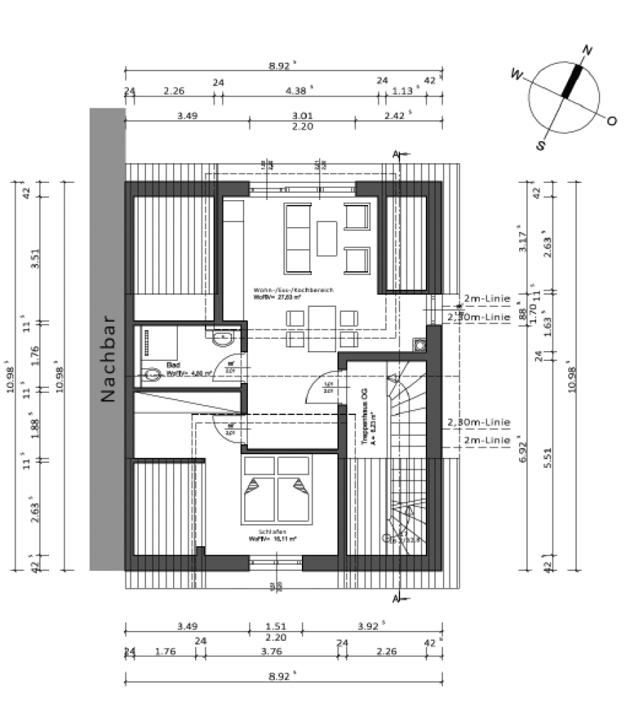 Der aktuelle Bauschein vom 22.09.2023 erlaubt die Errichtung von zwei Wohneinheiten mit folgenden Flächen: