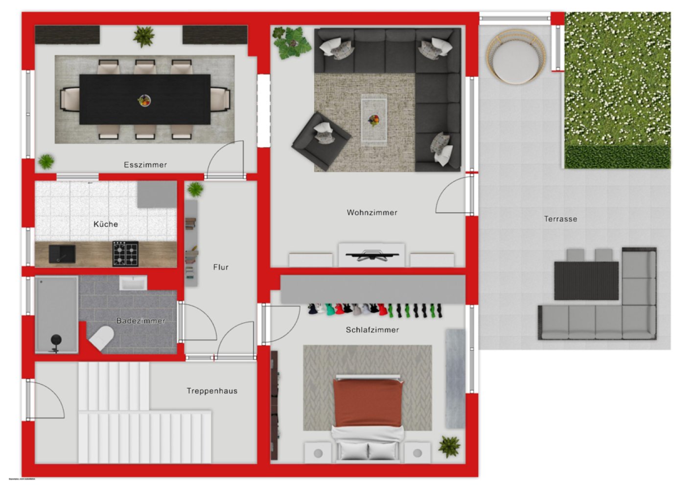 Wohnzimmer, Esszimmer, Schlafzimmer, Küche, Badezimmer, Terrasse mit Zugang zum Garten