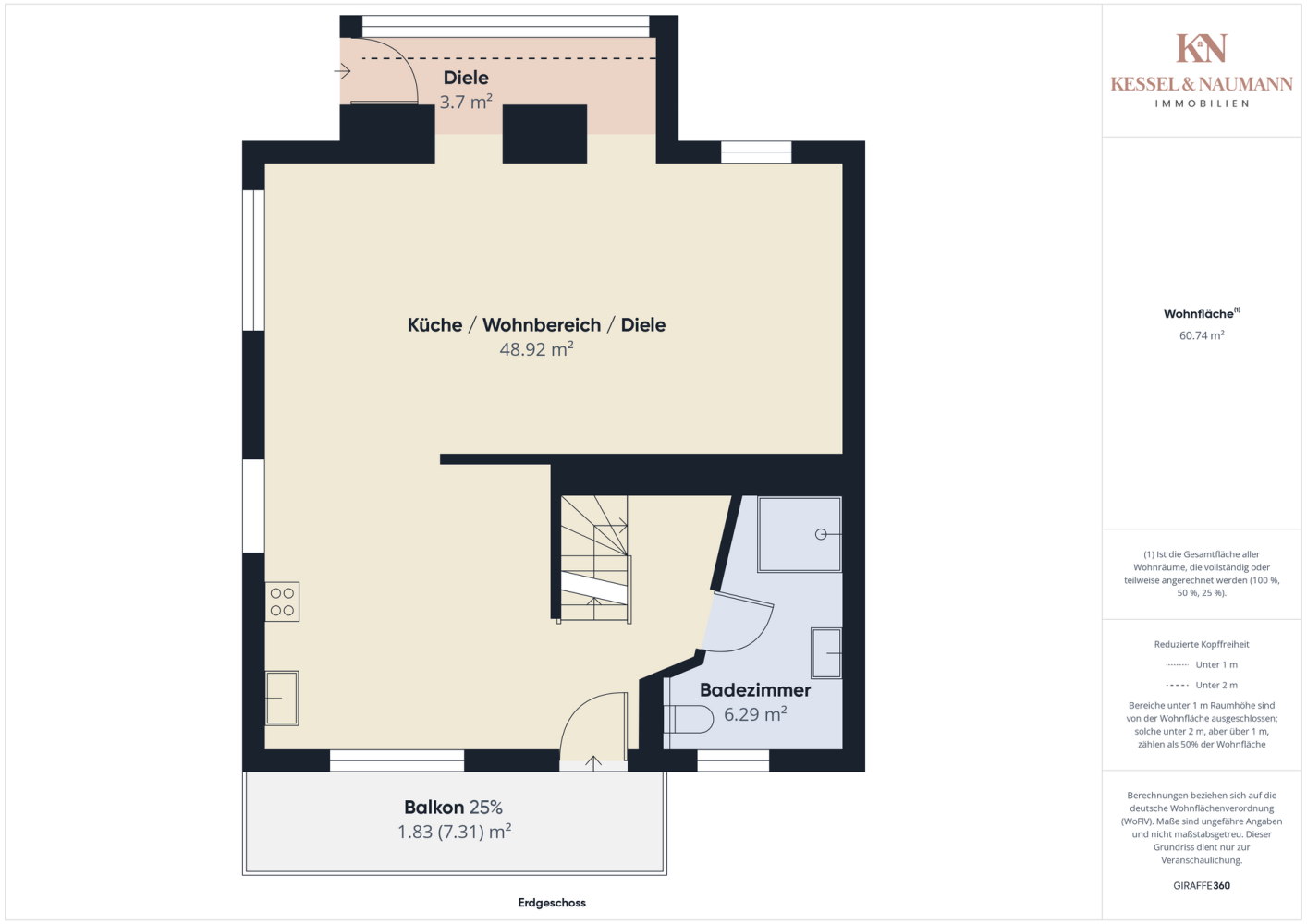 49 m², der zum Mittelpunkt des täglichen Lebens wird. Die hellen Oberflächen und die moderne Gestaltung schaffen eine wohnliche Atmosphäre. Ergänzt wird diese Ebene durch das modernisierte Tageslichtbad mit Dusche und WC sowie den Balkon (ca. 7,31 m²) mit schönem Blick ins Grüne.
