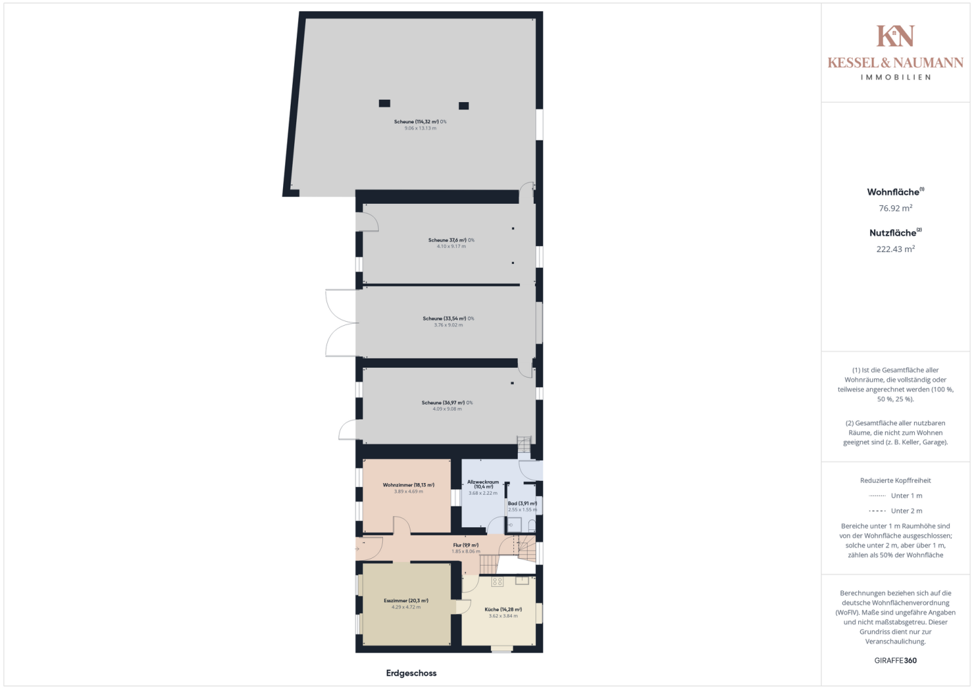 Die angeschlossene Scheune bietet ca. 217,43 m² Nutzfläche und eröffnet zahlreiche Möglichkeiten – ob als Werkstatt, Garage oder Lagerfläche. Ein Außenstellplatz befindet sich direkt auf dem Grundstück, zudem lässt sich ein Teil der Scheune bei Bedarf zur Garage umbauen.