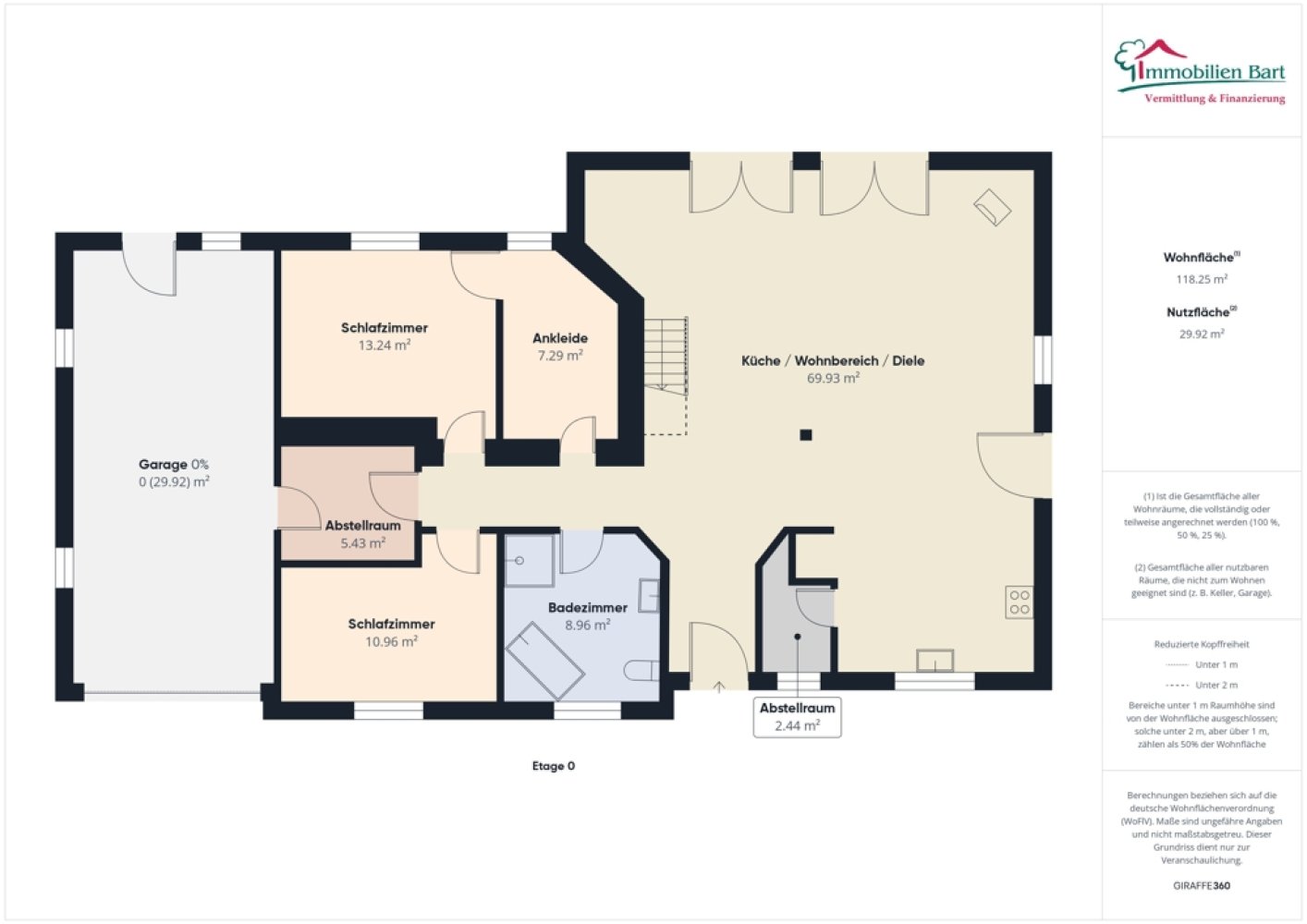 Eingangsbereich, Wohn-Essbereich mit offener Küche und Abstellraum und Zugang zur Terrasse und in den Garten, Flur, Schlafzimmer mit Ankleideraum, Schlafzimmer, Badezimmer, Abstellraum mit Zugang zur Garage mit Waschküche