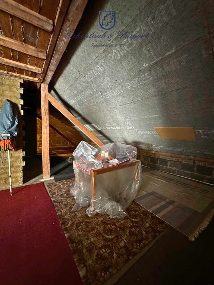 Über ein offenes Treppenhaus verbunden befindet sich die Ausbaufläche im DG, wo mit wenigem Aufwand, verbunden mit dem Einbau von Dachflächenfenstern, weiterer Wohnraum, ggf. eine eigene weitere Einheit, geschaffen werden kann.