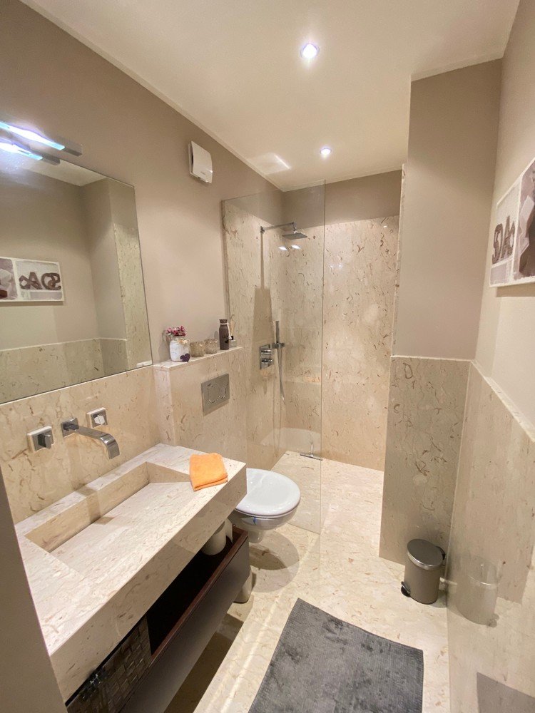 Hauptbad Boden Tassos Marmor aus Griechenland und an der Wand und im Bereich der Wanne