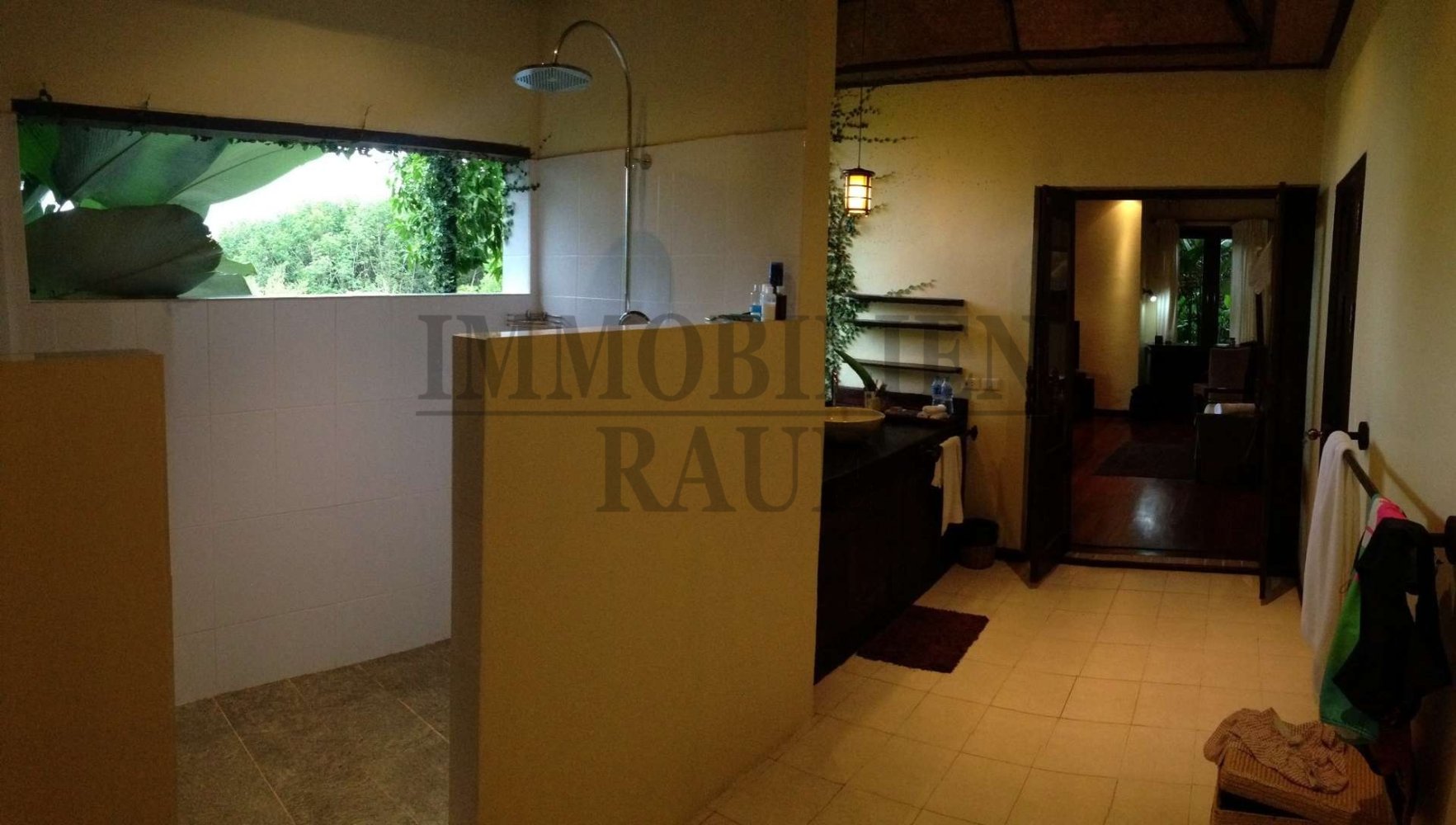 klimatisiertes Schlafzimmer, Kinderschlafzimmer (2 Betten), Badezimmer mit Dusch und sep. WC, offener Spabereich mit offener Dusche (inkl. Dschungelfeeling)
