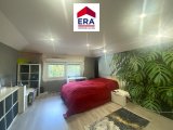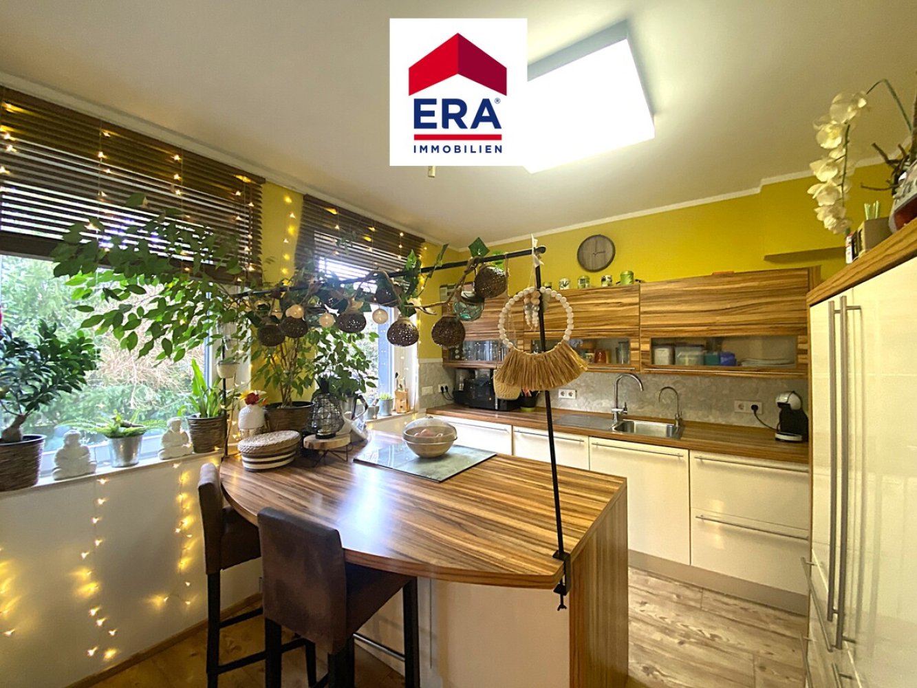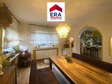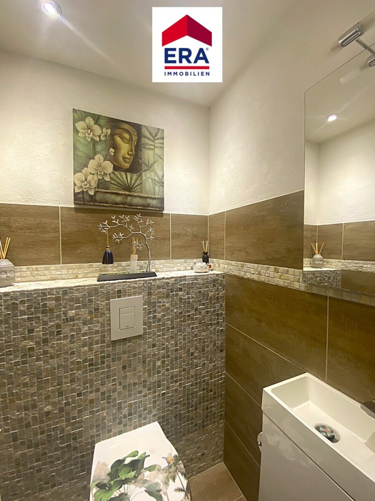 Über ein paar Außenstufen gelangen Sie zur Diele im EG mit Einbauschränken, hier befinden sich über 2 Ebenen, der helle Wohnbereich mit Kamin und der Zugang zum idyllischen Wintergarten mit Balkon und Markise. Des Weiteren finden Sie hier die Küche mit Sitztheke und Vorratskammer sowie das ansehnliche Esszimmer, ein exotisches Badezimmer mit Doppelwaschbecken und Wanne, ein separates WC mit Waschbecken, sowie 2 Schlafzimmer, eines davon mit Einbauschrank und eines mit Zugang zum Balkon mit Blick ins Grüne.