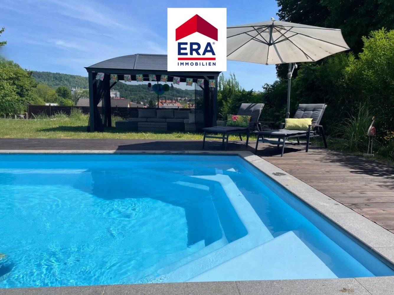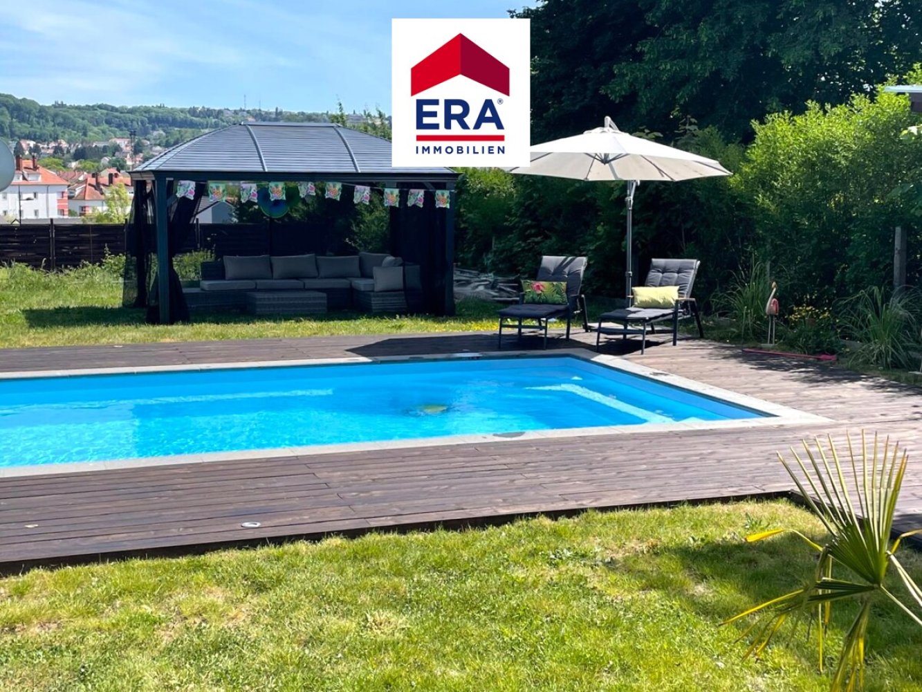 Der großzügige Garten mit Südausrichtung und eingelassenem Pool, lässt keine Wünsche offen. Hier ist bei außergewöhnlichem Weitblick, Entspannung garantiert, unter dem überdachten Terrassenbereich oder der gemütlichen Pergola, ist immer ein schattiges Plätzchen zu finden.